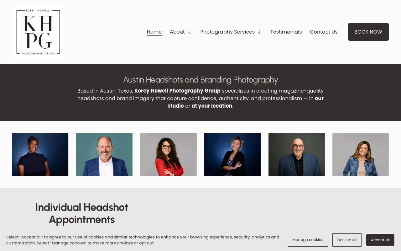 Operating out of the Business Park Drive area in northwest Austin, Korey Howell Photography Group is a highly established studio boasting a 5.0 rating from nearly 400 Google reviews. They offer a comprehensive suite of services including executive headshots, personal branding sessions, and corporate team photography. The studio provides a first-class hospitality experience, often greeting clients with beverages and a relaxing environment before the shoot begins. Reviewers frequently praise the fast, painless process and the immediate post-shoot photo selection, which allows clients to leave knowing exactly what they are getting. Their efficient workflow and dedicated retouching make them a strong contender for professionals seeking a premium, guided photography experience. Visit studio website