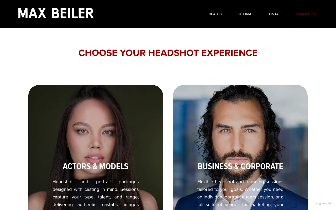 Professional headshots in Austin for actors, models, entrepreneurs, and corporate teams. Choose your path and get images designed to elevate your career. The website highlights services such as professional headshots, linkedin headshots, and corporate portraits. Google Maps currently shows a 5.0 rating from 66 reviews. One recent review notes: It was wonderful working with Max! He made me feel relaxed and made the whole process so fun. The hardest part was having to choose only a few photos at the end because he took so many incredible ones! He will make you look gooooood. I booked him for my acting headshots but ended up using the photos for my professional corporate headshots as well (even though I just had those done a few months earlier- these were better!) Would absolutely use him again and again for any headshot needs. Austin clients looking for polished, business-ready images should consider this studio if the portfolio style matches what they need. Visit studio website