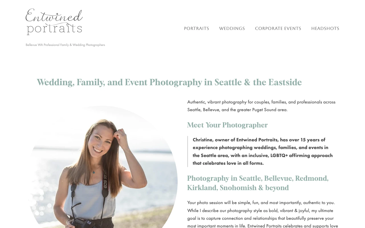 Positioned 10.96 miles from Bellevue in Woodinville, Entwined Portraits maintains a 5.0 rating from 21 reviews. Christine focuses on professional headshots, corporate portraits, and family photos. Reviewers consistently mention her warmth, charm, and ability to put clients at ease so their personalities shine through. Clients appreciate her clear direction, innate ability to find perfect lighting, and meticulous attention to detail. While located a bit further out, Christine's dedication to making subjects look their absolute best makes her a reliable choice for anyone needing high-quality professional images in the greater Bellevue area. Visit studio website