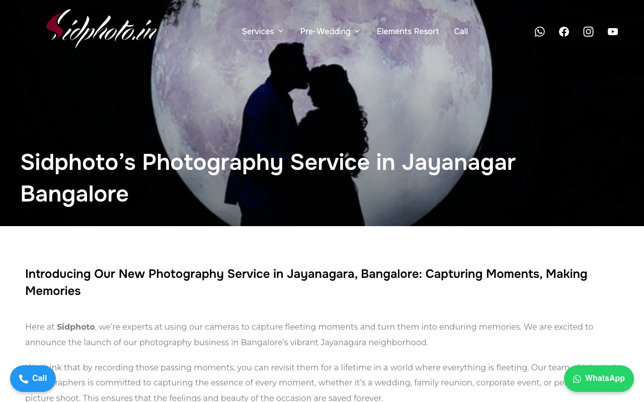 Hire Sidphoto, an award-winning photographer in Bangalore. Pre-wedding photographers in Bangalore to capture your wedding, pre-wedding, or any other event. You will be able to preserve the beautiful day's memories forever. The website highlights services such as photography service @ mysore, photography service @ jayanagar, and pre-wedding elements resort. Google Maps currently shows a 4.8 rating from 134 reviews. One recent review notes: One of my friends had their pre-wedding shoot with Sidphoto at Element Resort, and the pictures were just amazing. The photos looked so natural, creative, and full of emotions. Seeing their experience, I can confidently say Sidphoto is worth recommending to any couple looking for a memorable shoot. Bengaluru clients looking for polished, business-ready images should consider this studio if the portfolio style matches what they need. Visit studio website