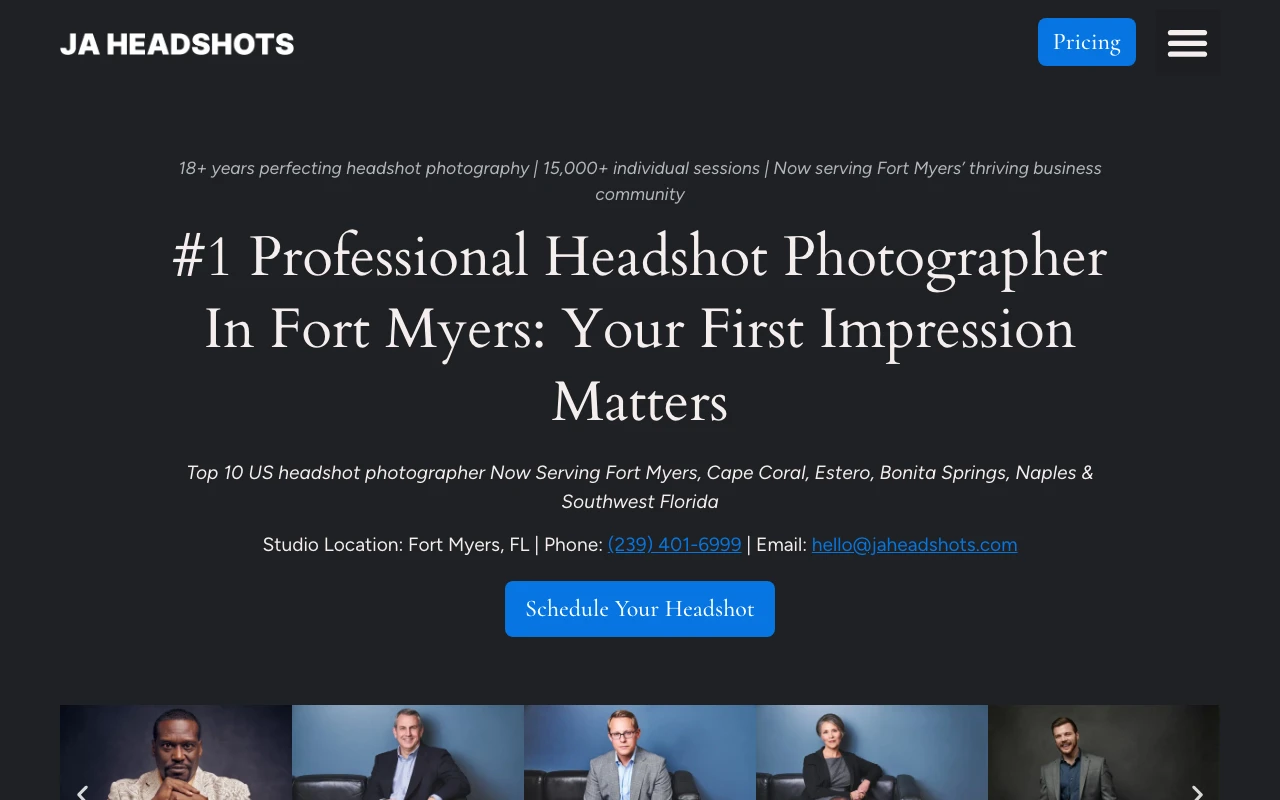 #1 Fort Myers headshot photographer. Professional CEO headshots, Business headshots, and Company headshots for your team. The website highlights services such as unlimited session time (no rushing, no pressure), expert direction for camera-shy professionals, and professional headshots. Google Maps currently shows a 5.0 rating from 2 reviews. One recent review notes: Joshua did some product photos to replace existing photos on a brochure that i have been needing to update. My needs were pretty specific, but he overdelivered. Not only did he give me the exact shot i thought i needed, he gave me a few other creative options that i will work even better and be able to use more universally in my brand’s marketing moving forward. The image turnaround was wildly quick. I have an extensive marketing background and have worked with a lot of photographers in the past- and while these were just simple product photos, the innate talent to be able to deliver exactly what I needed, provide additional creative direction and insight and turn them around so quickly was really impressive. Highly recommend him for any creative photography you have. His talents extend far beyond professional headshots. Cape Coral clients looking for polished, business-ready images should consider this studio if the portfolio style matches what they need. Visit studio website