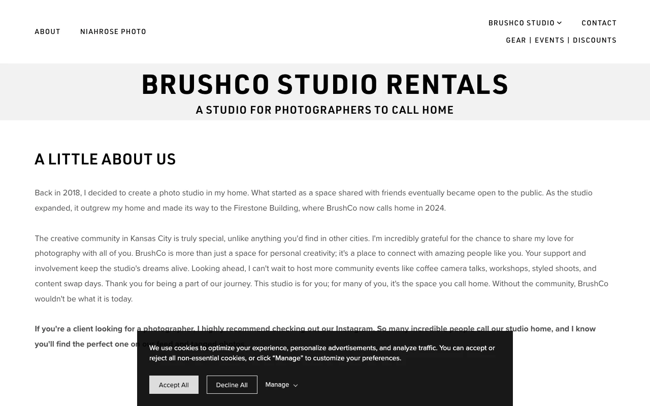 Discover BrushCo Studio's two unique photography spaces in KC's Crossroads. Natural light studios available daily with professional amenities and skyline views. The website highlights services such as brushco studio about us & studios, gear | events | discounts, and east & south facing windows. Google Maps currently shows a 5.0 rating from 18 reviews. One recent review notes: BrushCo Studio is the best. It’s a bit of a drive for my clients and I but SO SO worth it. The online booking process makes reservations so easy. Instructions are clear and very helpful in navigating the studio. This is such a versatile space. I’ve shot maternity, family, couples, headshots, a little bit of everything here. Love this place!! Kansas City clients looking for polished, business-ready images should consider this studio if the portfolio style matches what they need. Visit studio website