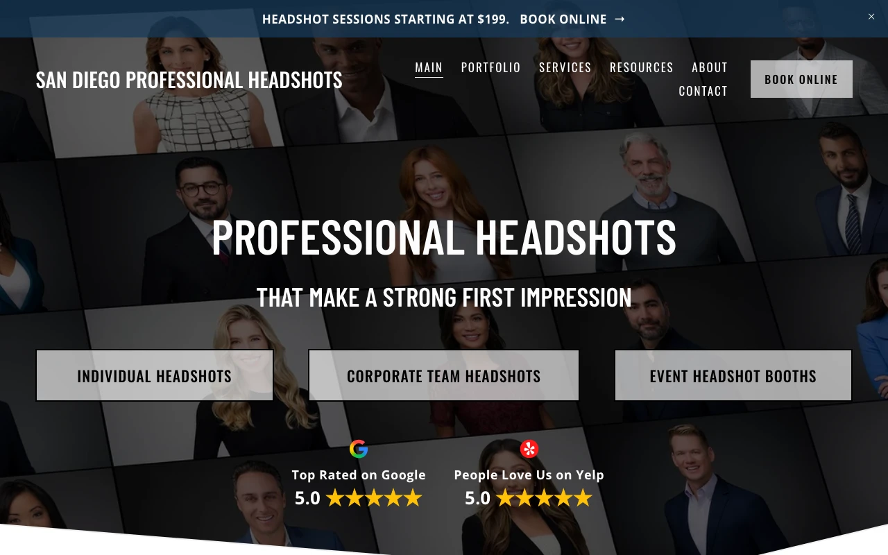 San Diego headshot portfolio of Michael Pearce. Headshots, business headshots, corporate headshots, senior portraits, portrait photographer, actor photos, Instagram branding photographer, brand photographer. The website highlights services such as professional headshots, linkedin headshots, and corporate portraits. Google Maps currently shows a 5.0 rating from 151 reviews. One recent review notes: I had a fantastic experience with Michael Pearce Photography! Michael was professional, incredibly friendly, and very accommodating from start to finish. We had a quick chat before the session where he shared some great ideas, and during the shoot he was more than willing to try different backgrounds and looks to get the best results. I walked away with multiple shots that made me feel professional, confident, and truly like myself - which is exactly what you want from headshots. He is a true pro who makes the whole process comfortable and enjoyable. I highly recommend connecting with him if you’re looking for actor headshots! San Diego clients looking for polished, business-ready images should consider this studio if the portfolio style matches what they need. Visit studio website