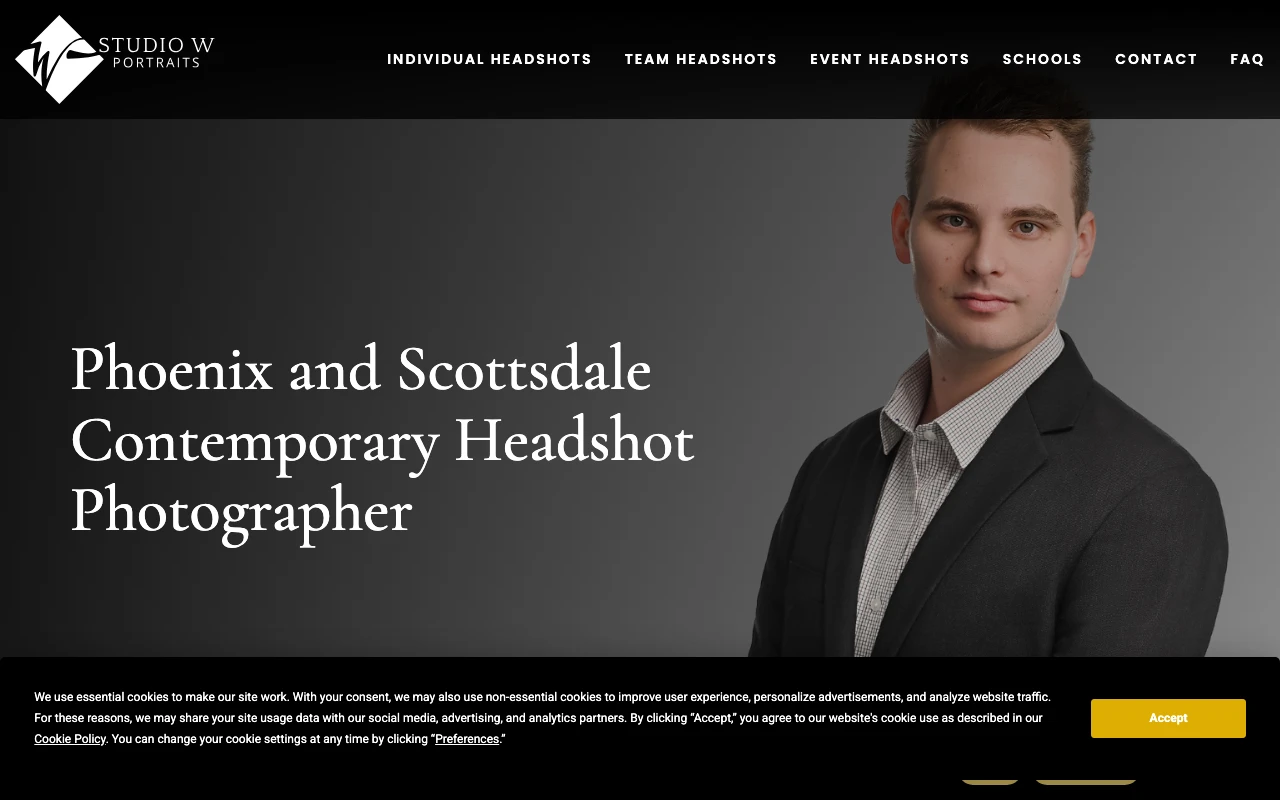Located just 0.15 miles from central Scottsdale on East Main Street, Studio W Portraits is run by a responsive team that excels in both individual and corporate team headshots. Holding a 4.9 rating from 61 Google reviews, photographers Whitney and Kim are celebrated for their prompt communication and efficient on-site setups. Reviewers frequently mention their attention to detail, noting they bring everything from translucent powder to combs to ensure clients look their best. Clients appreciate the transparent process, where the team explains cropping and takes multiple shots for immediate review. Their faster-than-expected turnaround times make them a strong option for busy professionals needing rapid results. Visit studio website