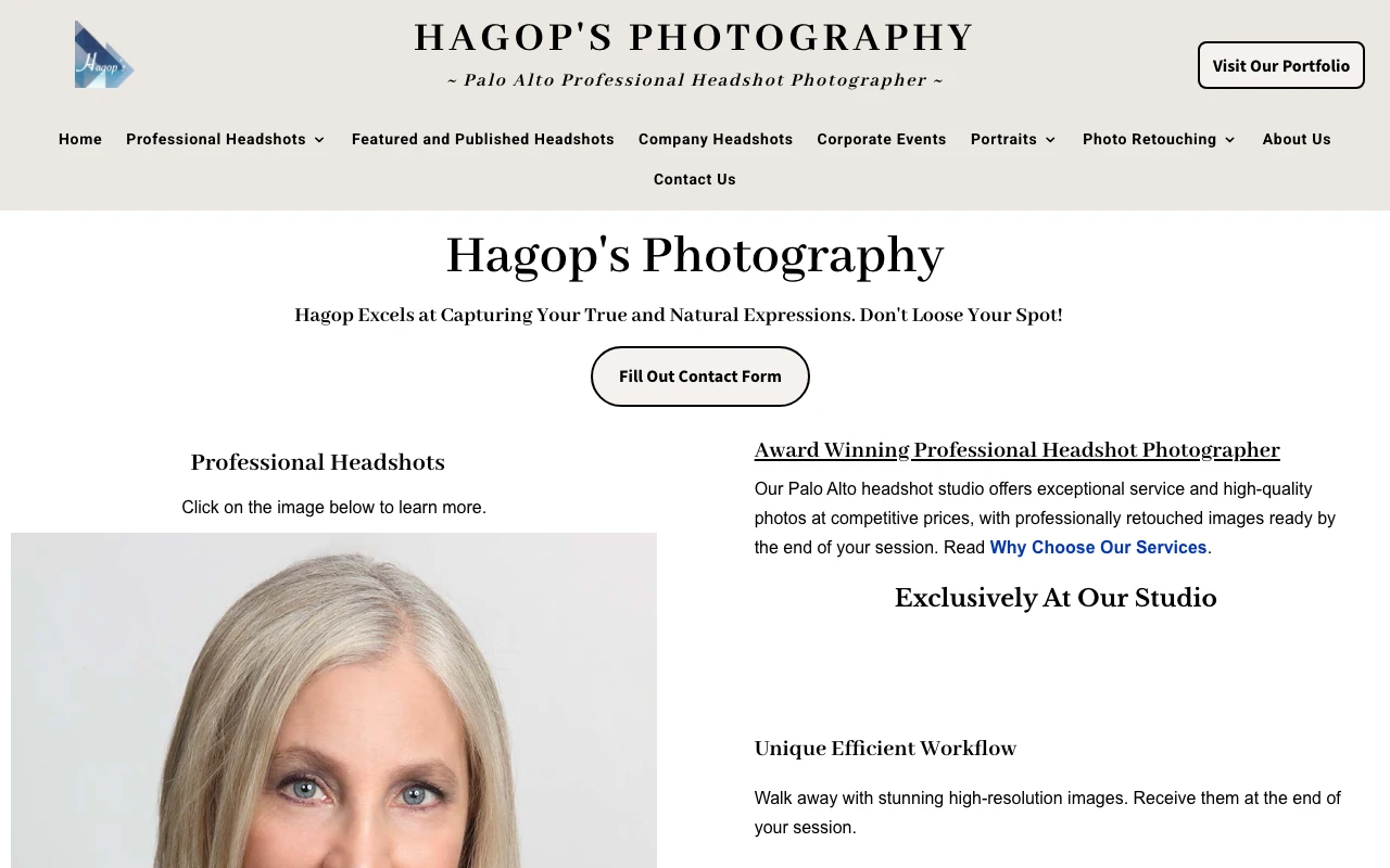 Palo Alto Headshot Photographer for Business Headshots, Executive headshots, Corporate headshots, Acting headshots, Modeling headshots and LinkedIn headshots. The website highlights services such as professional headshotsbusiness headshots, clothing suggestions, and prepare for your headshot. Google Maps currently shows a 4.9 rating from 68 reviews. One recent review notes: This was our second photo session with Hagop's Photography, and both times my wife and I have been very pleased with the process as well as with the results. Hagop and Ano are very knowledgeable and professional, taking the time to explain the process and what makes for a great business portrait. They expertly and professionally guided us through the process, taking the time to explore different alternatives to find the right pose, expression, and lighting that was appropriate for the purpose of this business headshot. We very much appreciated Hagop's and Ano's patience in taking time to make sure that we happy with the result. We can wholeheartedly recommend Hagop's Photography, and we will for sure come back the next time we need a portrait. Sunnyvale clients looking for polished, business-ready images should consider this studio if the portfolio style matches what they need. Visit studio website