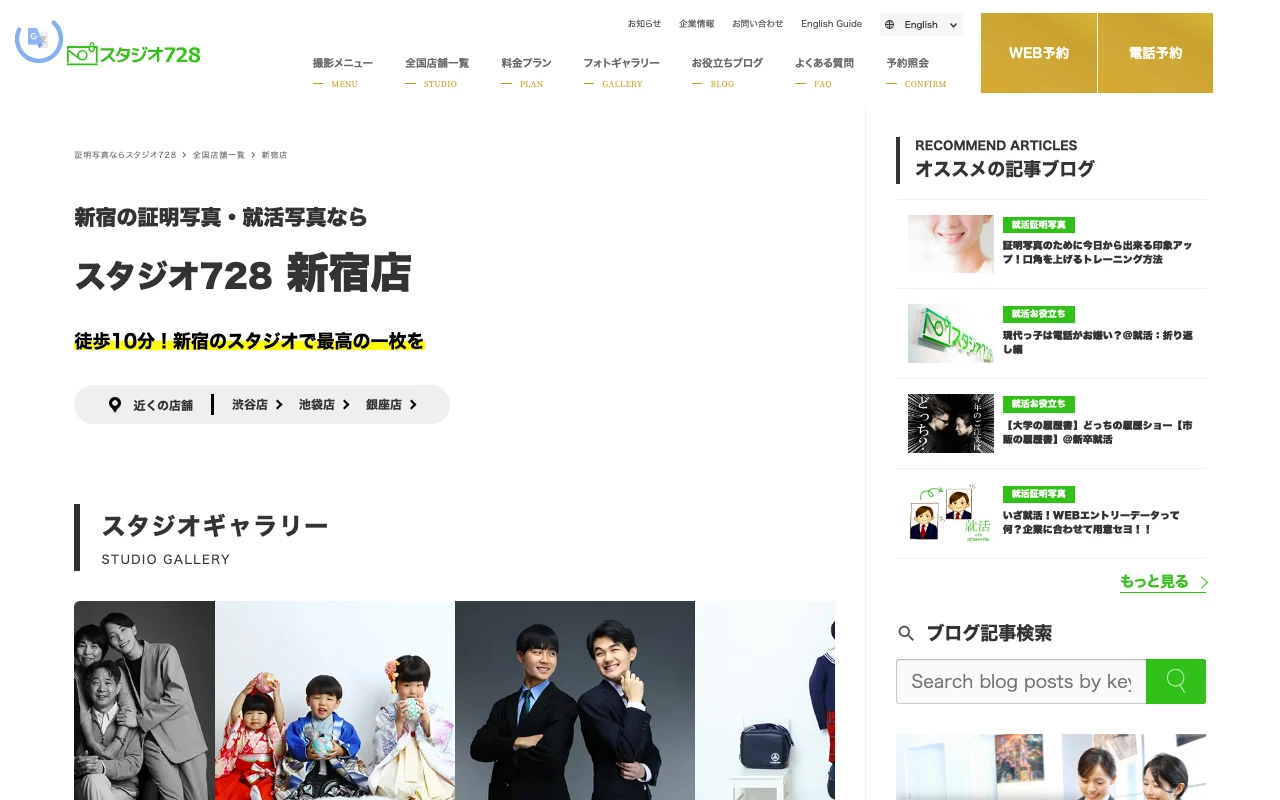 Located near the Shinjuku South Exit, Studio 728 has earned a 4.8-star rating from 309 reviews. It is a popular destination for those needing SNS icons or professional business portraits. The studio offers a dedicated makeup area with self-use hair spray and supplies, allowing you to prep before the session. If you prefer professional help, hair and makeup services can be booked in advance. The photographers are known for their friendly approach, helping to adjust posture and facial expressions to get a natural look. A unique feature of this studio is their refund guarantee for job-hunting photo menus if you are not satisfied with the results. They also provide skin-correcting retouching as part of their standard packages. After the shoot, you can review the images on-site and select your favorites for final processing. Visit studio website