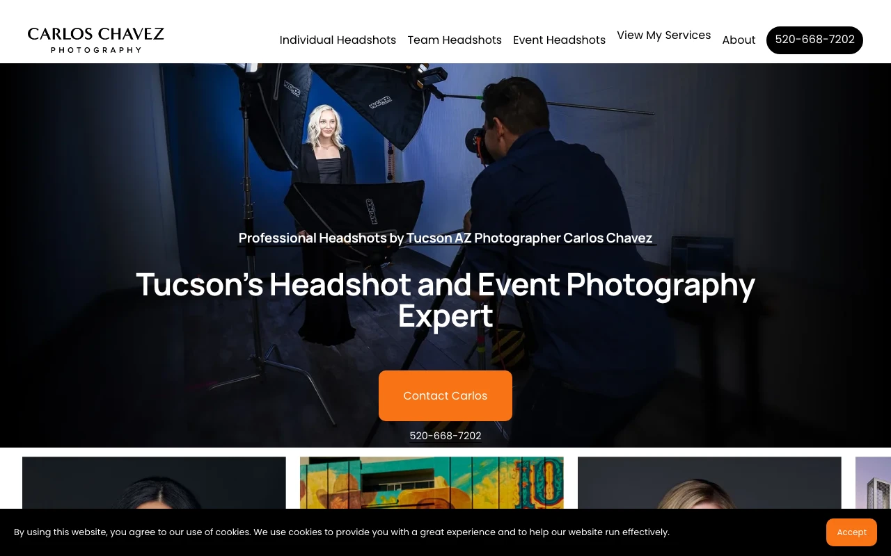Located just over three miles from downtown on South Tucson Boulevard, Carlos Chavez Photography specializes directly in headshot services. The studio maintains a flawless 5.0 rating from 162 Google reviews. Carlos is highly regarded for his quick response times and efficient, professional studio setup. Reviewers frequently mention his clear instructions during the shoot, which help clients achieve the best possible angles and expressions. The studio offers specific packages for individual headshots, event headshots, and architectural photography. Clients appreciate the friendly atmosphere and the high quality of the final digital files. You can request an appointment through the contact form on his website. This location is ideal for professionals seeking a streamlined, focused portrait session near the city center. Visit studio website