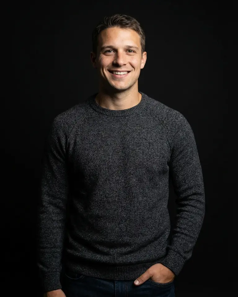 See yourself in a modern casting headshot that projects immediate confidence. The pitch-black background and textured charcoal knit create a sharp contrast that draws focus right to your smile. Professional studio lighting adds depth for a polished, industry-ready profile.