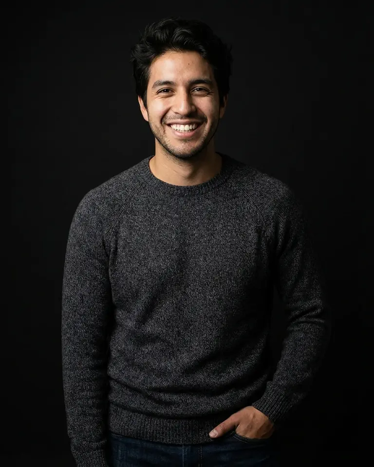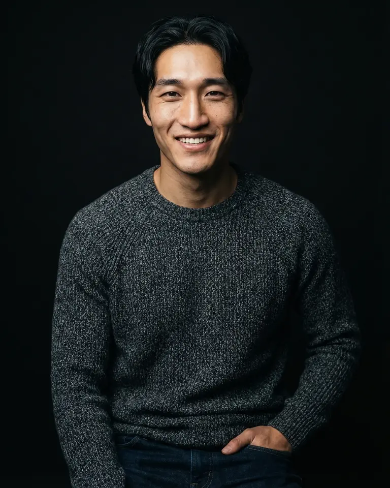 - Expression: Genuine broad radiant smile, upper teeth clearly visible, eyes crinkled with authentic joy, energetic and approachable.