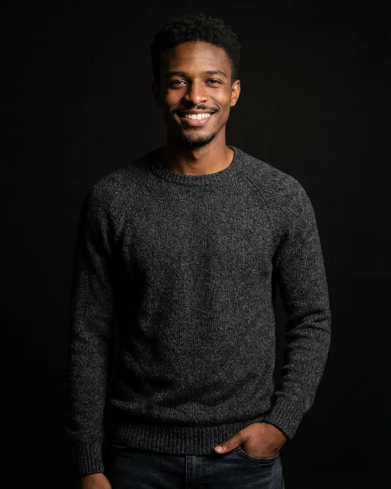 - Details: Dark charcoal grey marled/heathered knit sweater. CRITICAL DETAILS: Must have RAGLAN sleeves (diagonal seam from collar to underarm) and visible heavy salt-and-pepper texture. NOT a light grey fine knit, NOT set-in sleeves. Dark indigo/black jeans visible at waist.