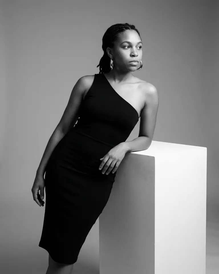 - Details: Black form-fitting asymmetrical one-shoulder dress (critical) with a single strap on the left shoulder and sleeveless right side. Large metallic hoop earrings (critical). Hair styled sleek, polished, and pulled back tight to the head (maintaining natural texture but styled for neatness).