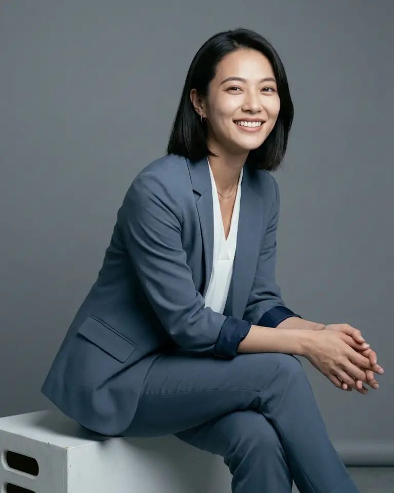 - Pose: Seated on a white box, body angled 30 degrees to the right. Upper body leaning slightly forward but keeping spine relatively straight (NOT hunched over).