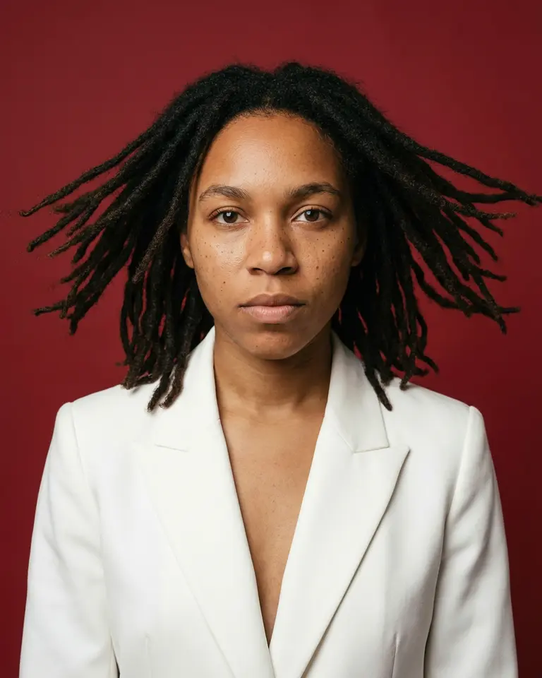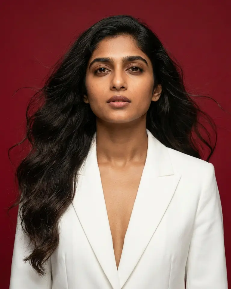 - Lens Feel: Portrait telephoto (85mm), flattering compression, sharp focus on eyes with slight falloff towards hair tips