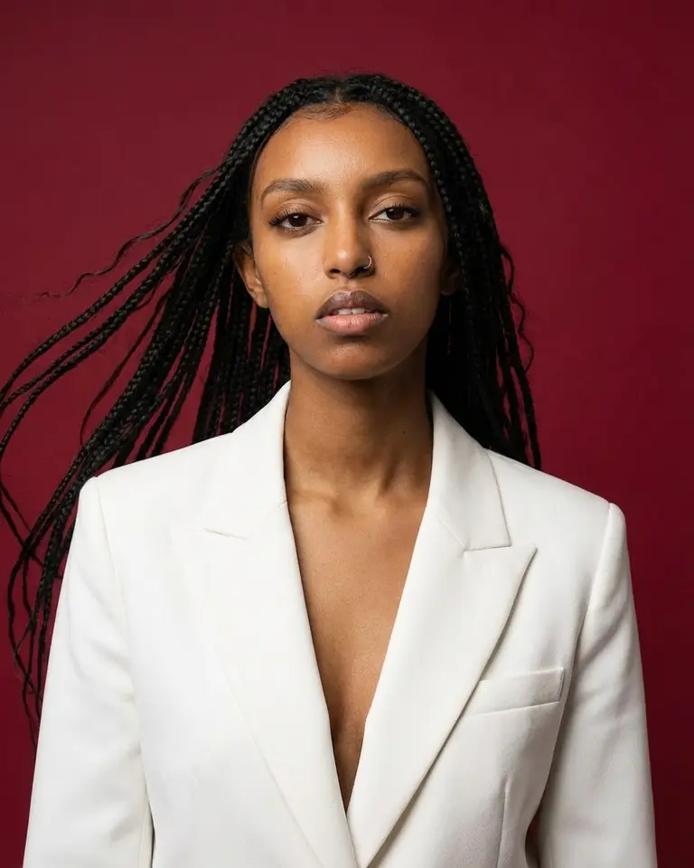 - Atmosphere: Minimalist high-fashion studio, pristine and bold