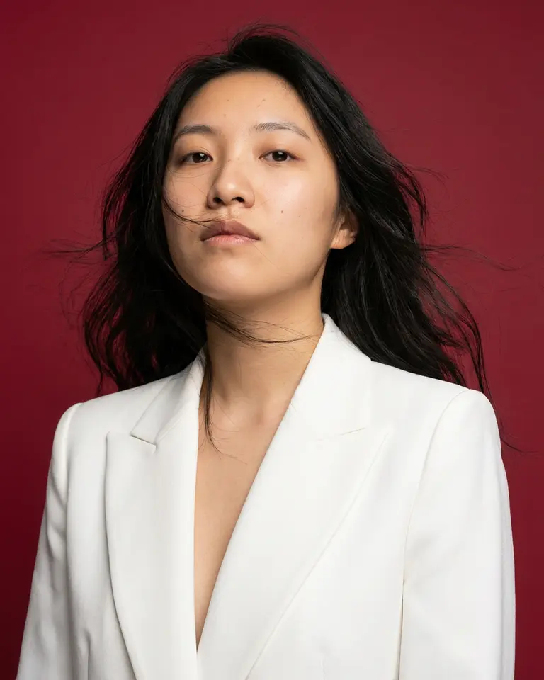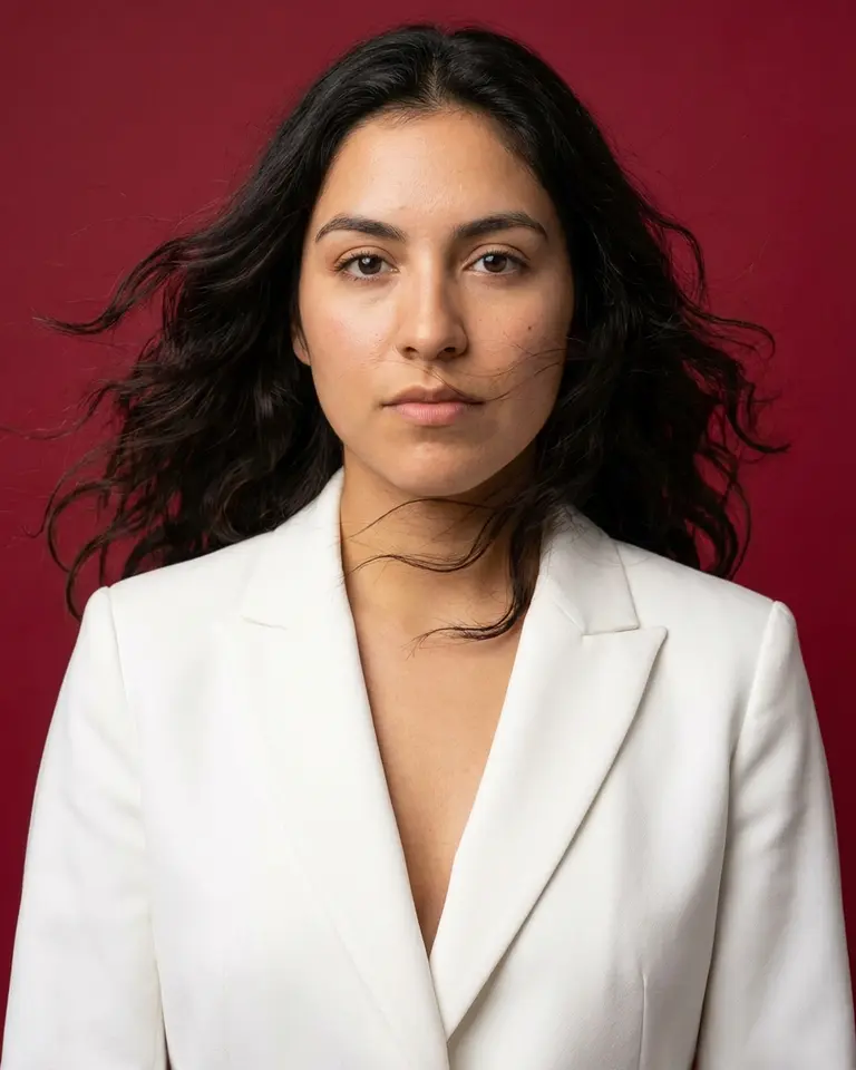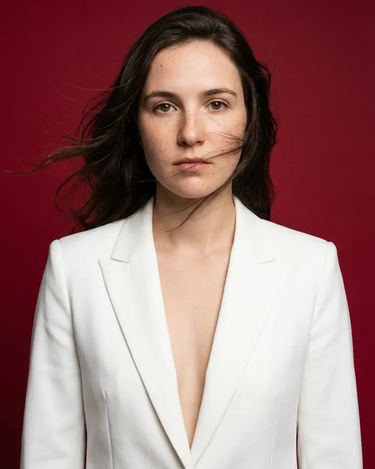 - Details: White structured tailored blazer jacket with sharp lapels (critical), deep V-neckline with no visible undershirt, clean lines. Hair styled with active windblown movement flowing outward and across face (critical), maintaining person's natural length and texture but adding dynamic studio fan effect.