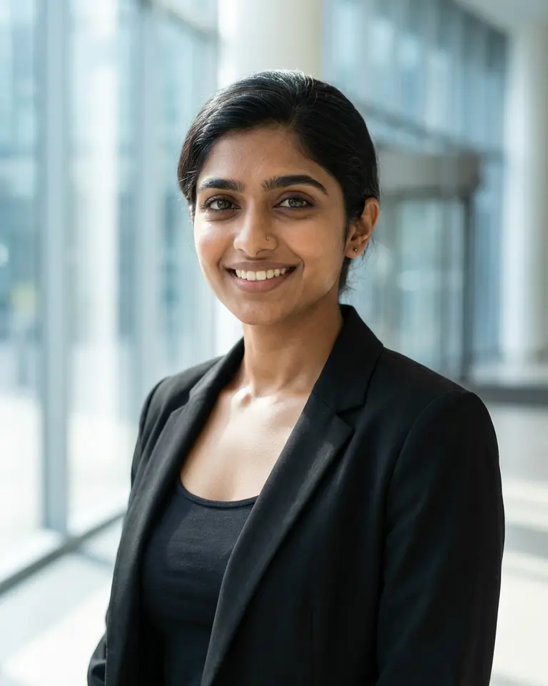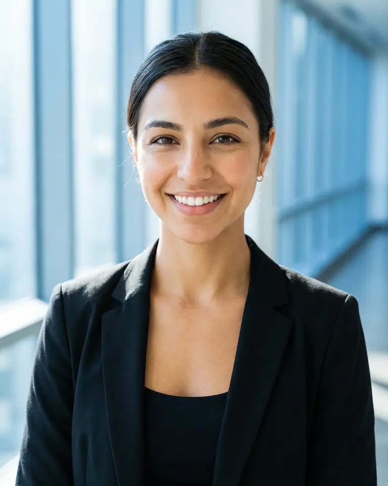 - Expression: Genuine, approachable smile with cheeks engaged (critical - NOT serious or neutral), radiating kindness and professionalism.