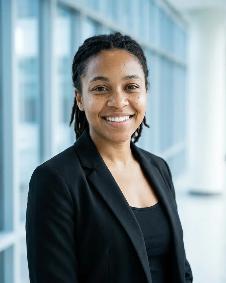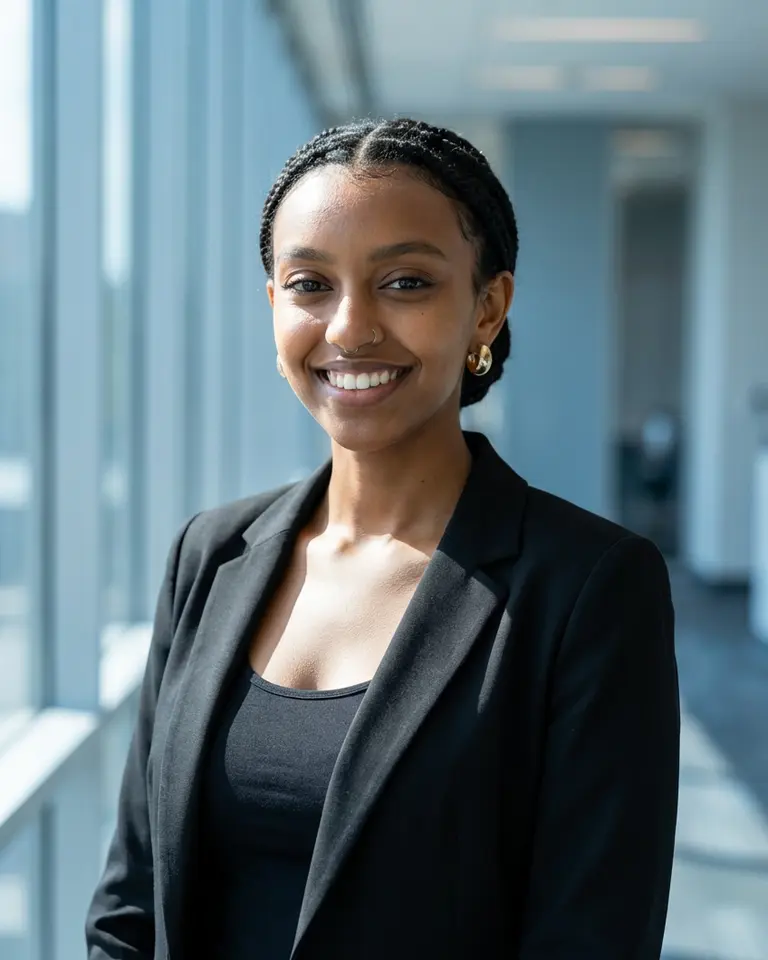 - Hair: Styled back neatly away from face, professional and controlled, respecting person's natural texture.