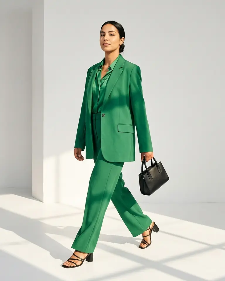 Step into the clean lines of a contemporary luxury lookbook with this vivid monochromatic style. You are captured mid-stride in an emerald green relaxed suit, framed by a minimalist white studio and architectural sun-drenched shadows. The mix of sharp tailoring and warm natural light gives your image a sophisticated editorial edge.