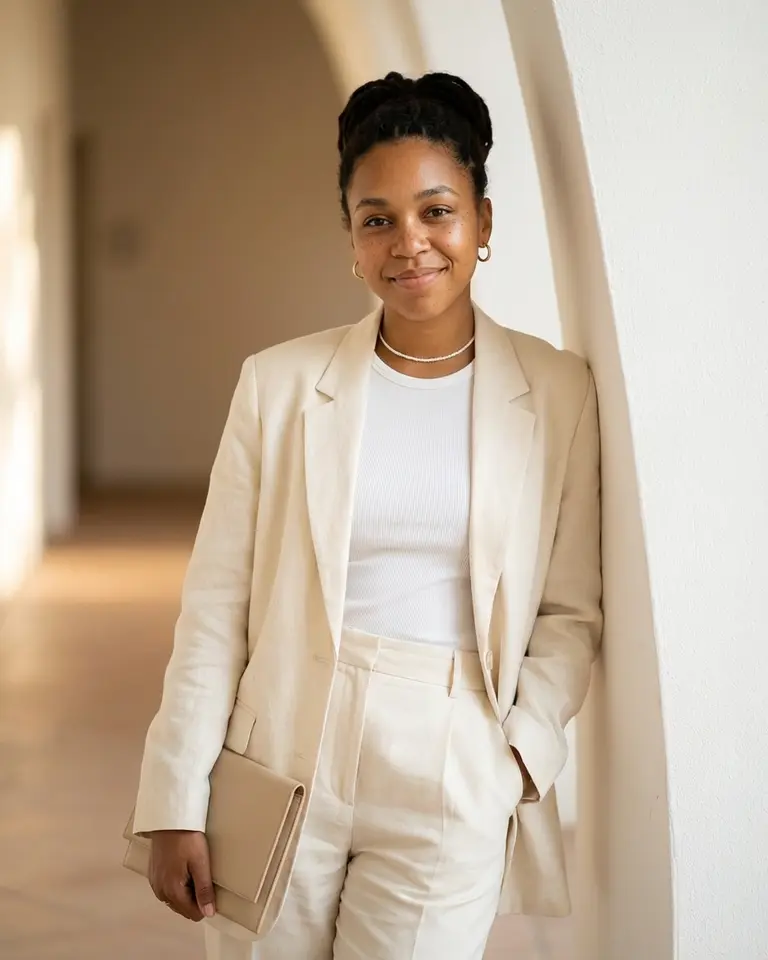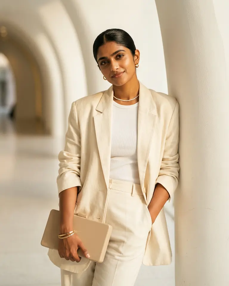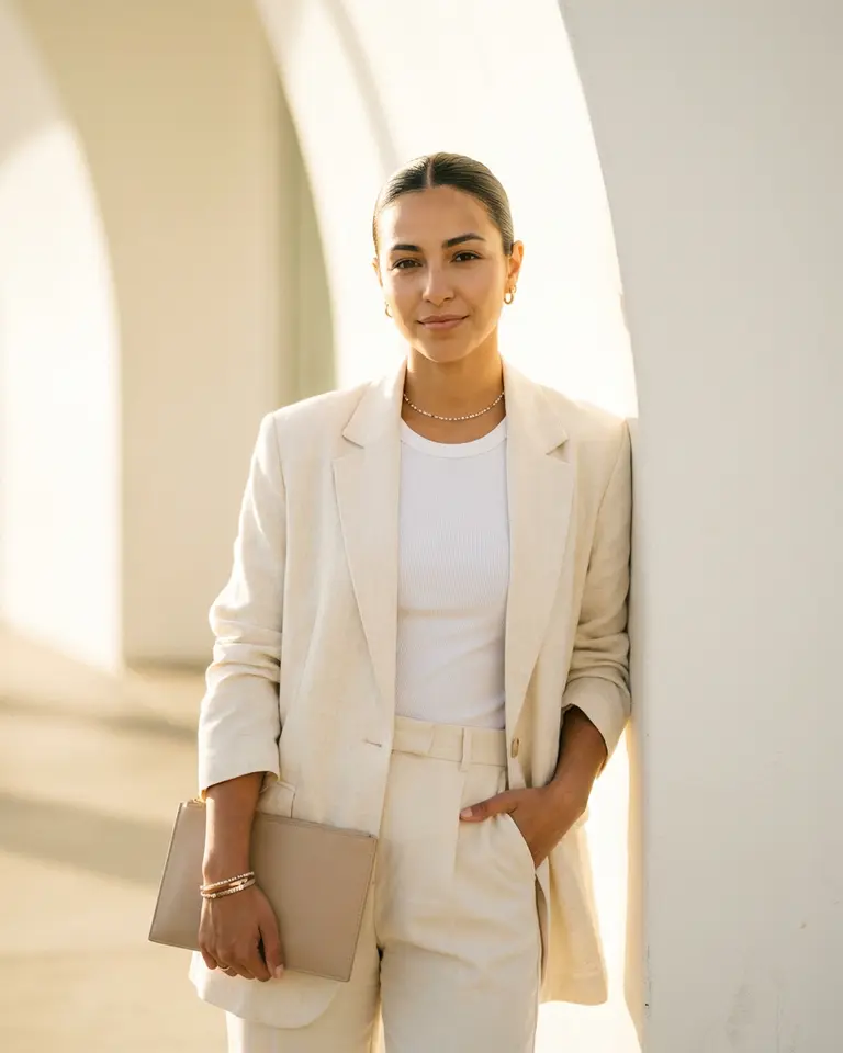 Embody the quiet luxury of the "Old Money" aesthetic in this polished, monochromatic portrait. You are styled in tailored creams and an unstructured blazer, bathed in a soft, sun-drenched golden glow. This look conveys an expensive, serene confidence that feels completely effortless.