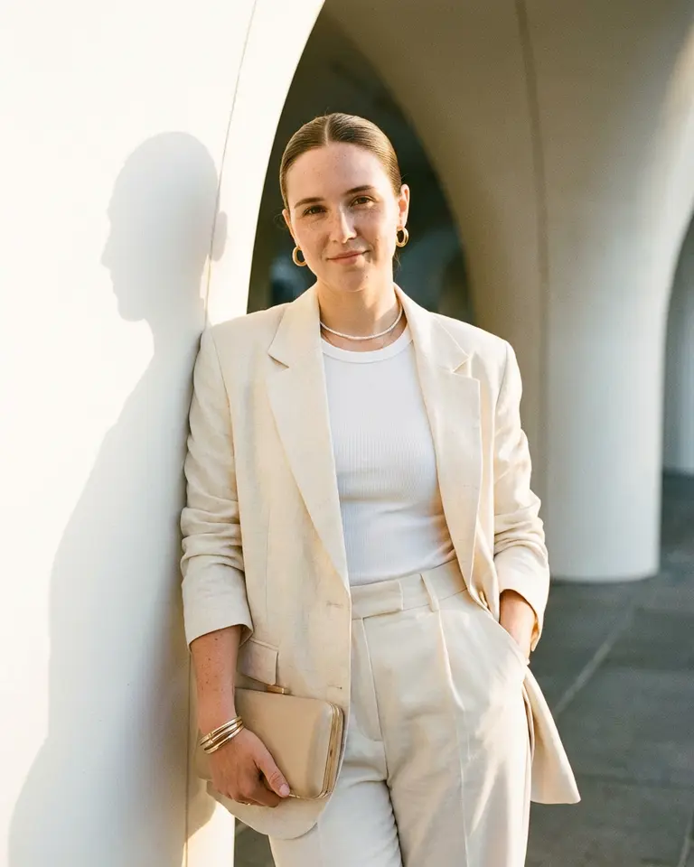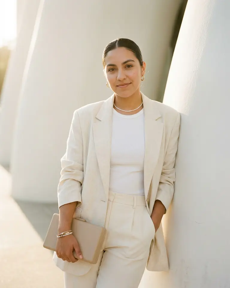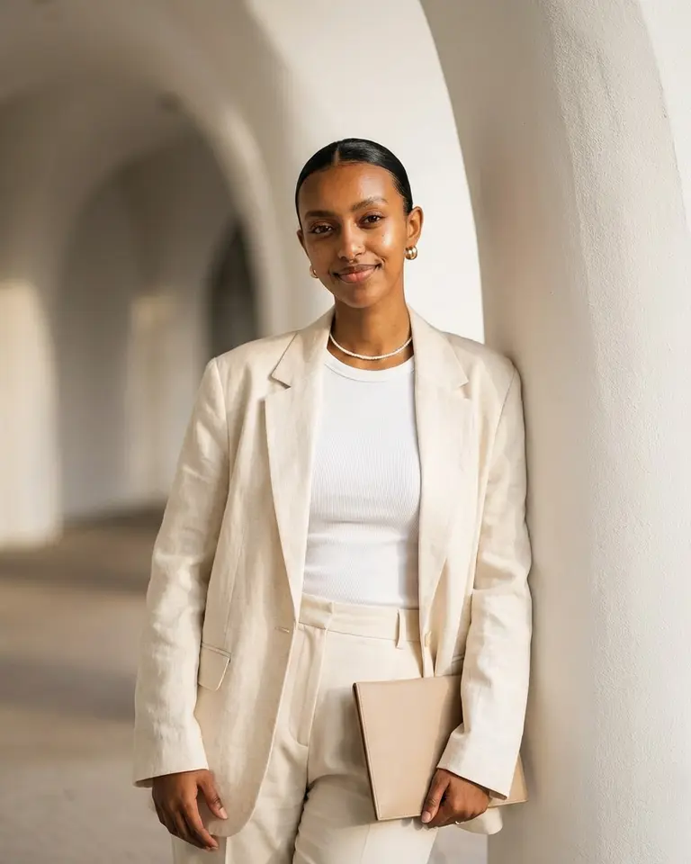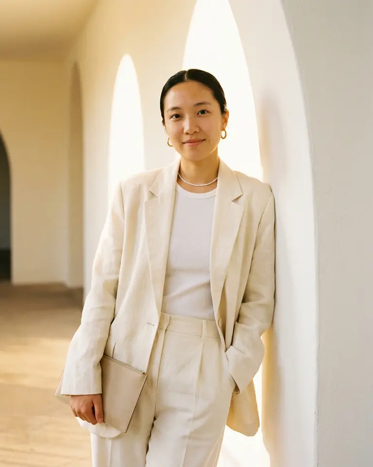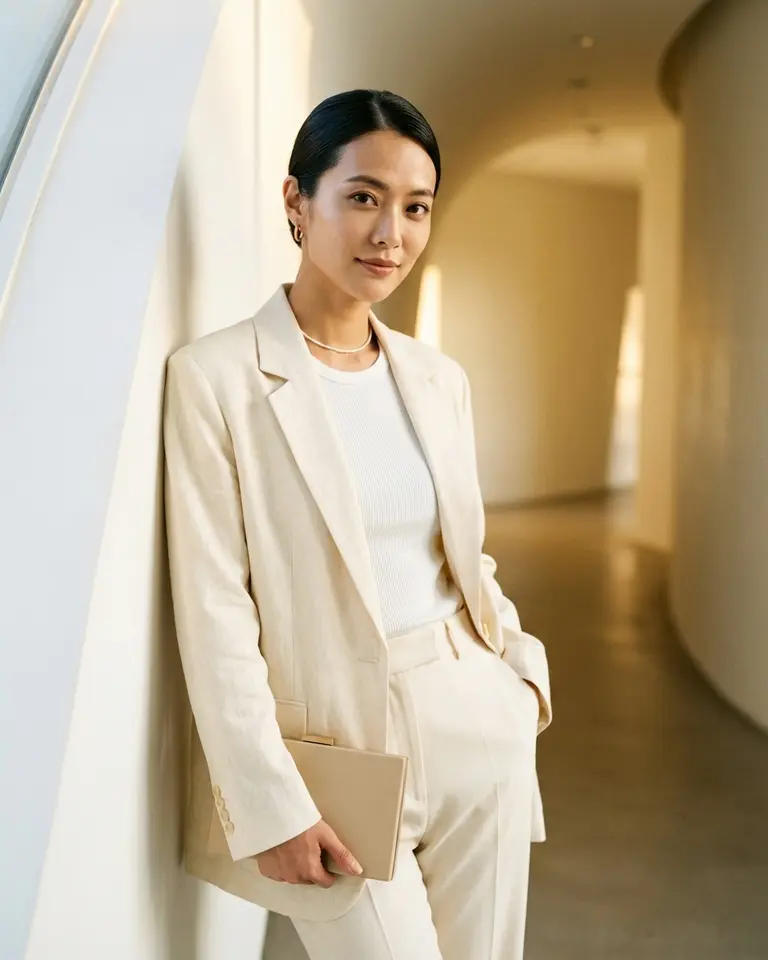 - Details: Oversized unstructured cream blazer (linen-blend texture), white ribbed crew-neck top tucked in, high-waisted cream trousers.