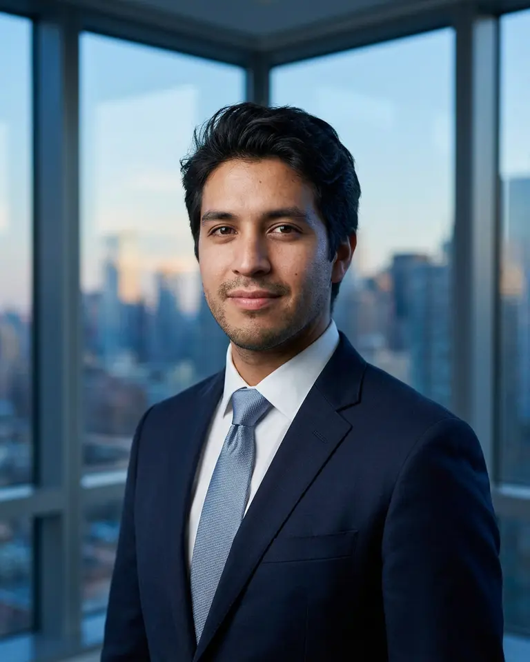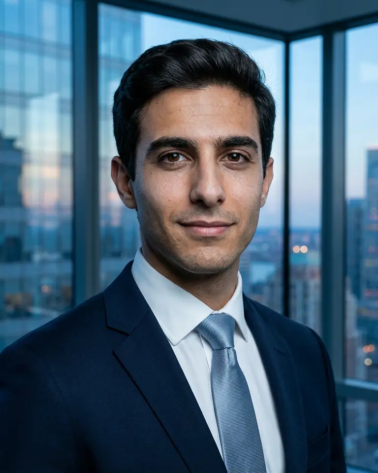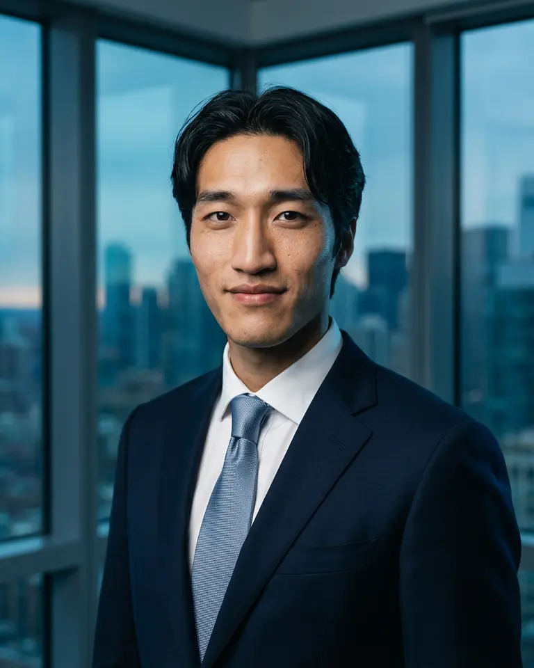 - Pose: Classic head-and-shoulders corporate portrait, body angled 30° toward right, head turned to face camera directly, shoulders relaxed