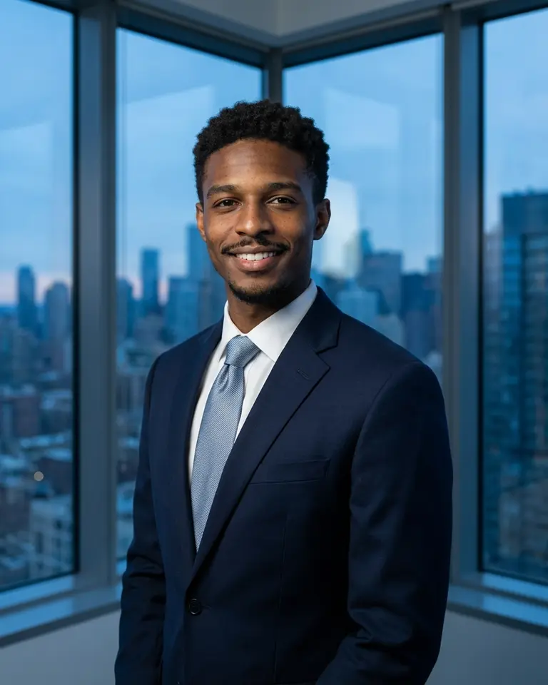- Details: Dark navy blue suit jacket with notched lapel (critical), crisp white collared dress shirt, textured silver-blue silk necktie (critical). Hair styled neatly with professional grooming appropriate to person's natural texture.