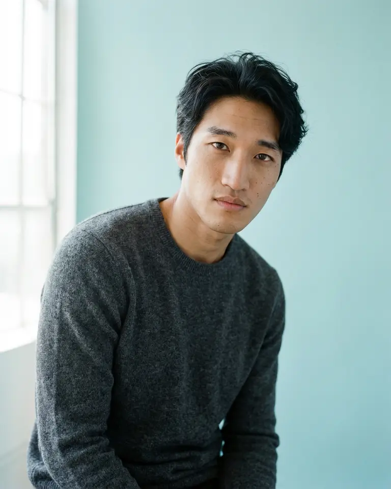 - Hair: Styled with messy, matte texture; "bedhead" look, not perfectly groomed.