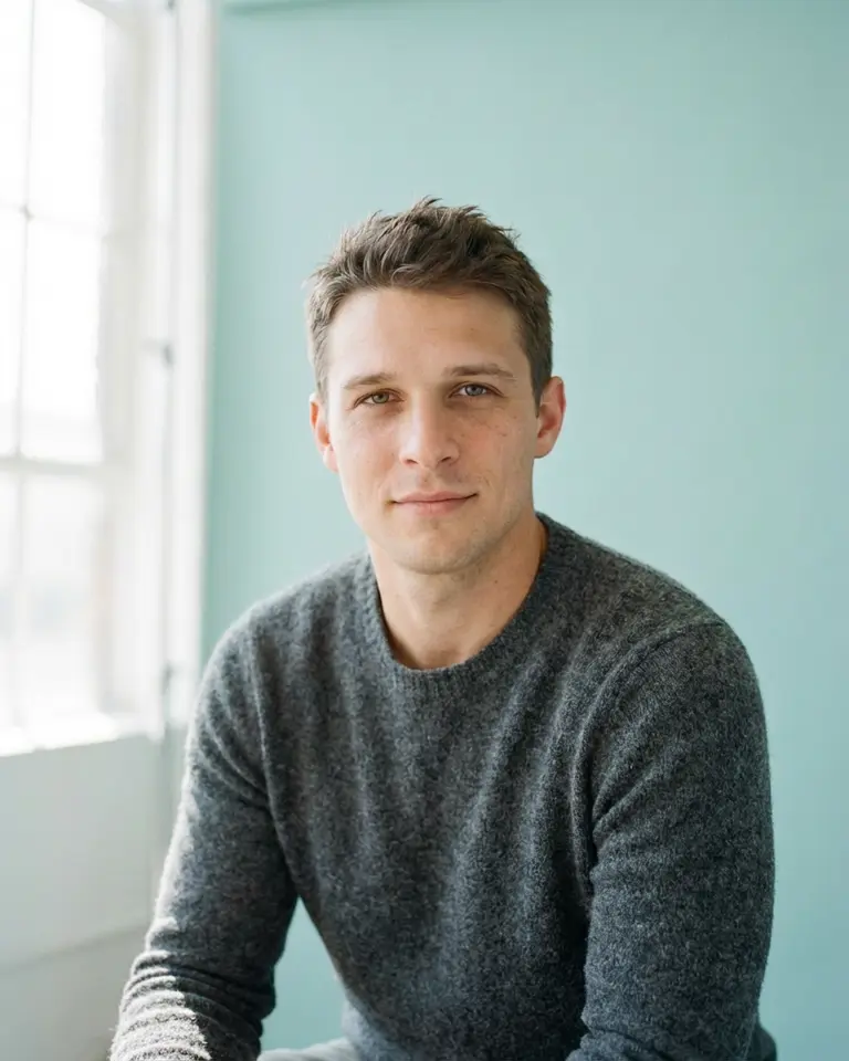 Step into the quiet minimalism of a Kinfolk-inspired editorial. This style pairs a signature muted teal backdrop with soft, airy window light and a cozy grey knit for an effortlessly relaxed look. The subtle film grain and pastel tones give your image the polished texture of medium format photography.