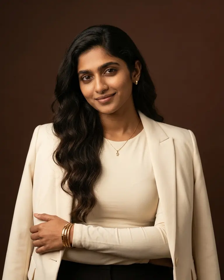 - Hair: Styled neatly, polished finish appropriate to natural texture.