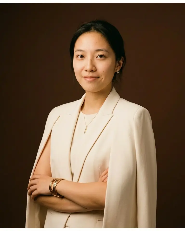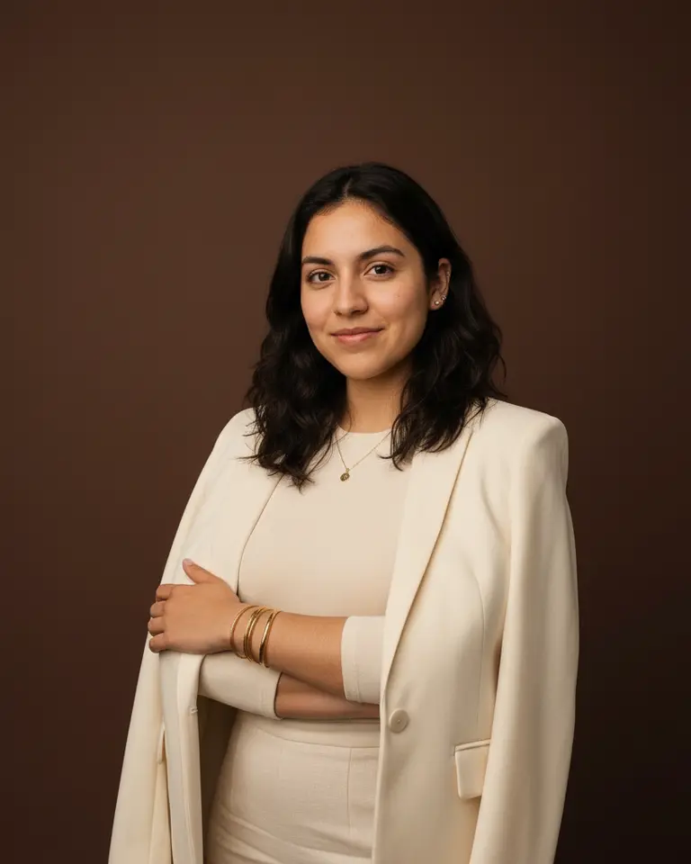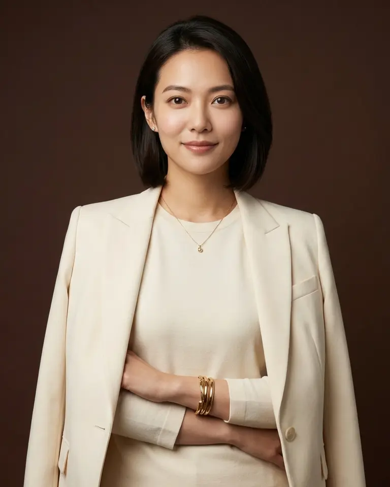 - Expression: Gentle approachable half-smile, warm and professional (NOT stern or blank).