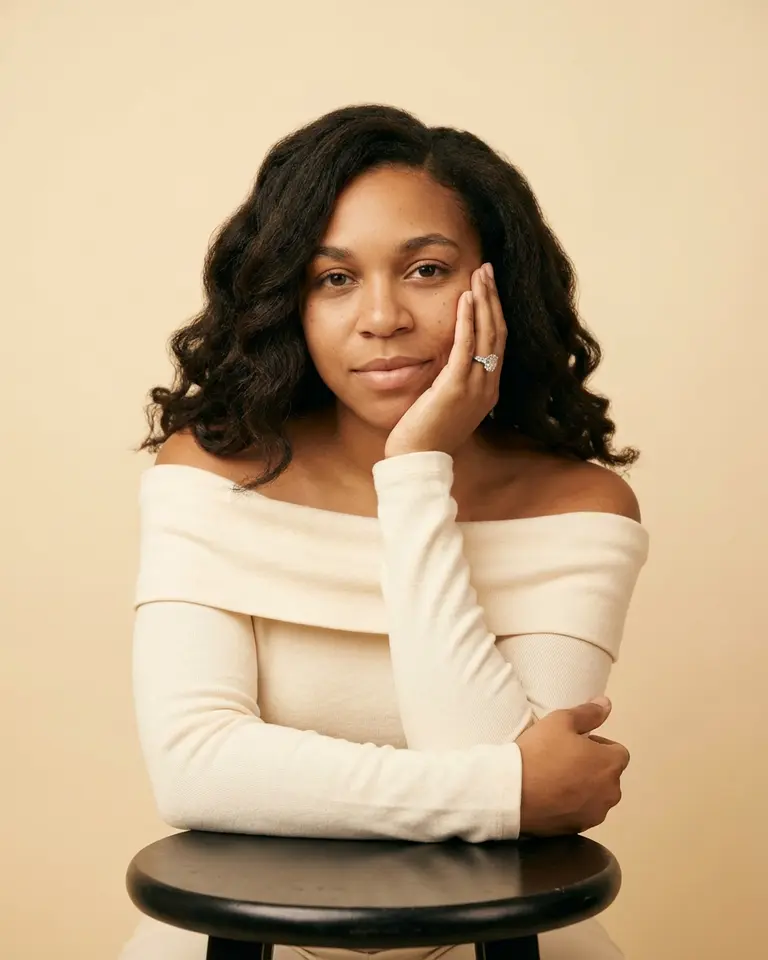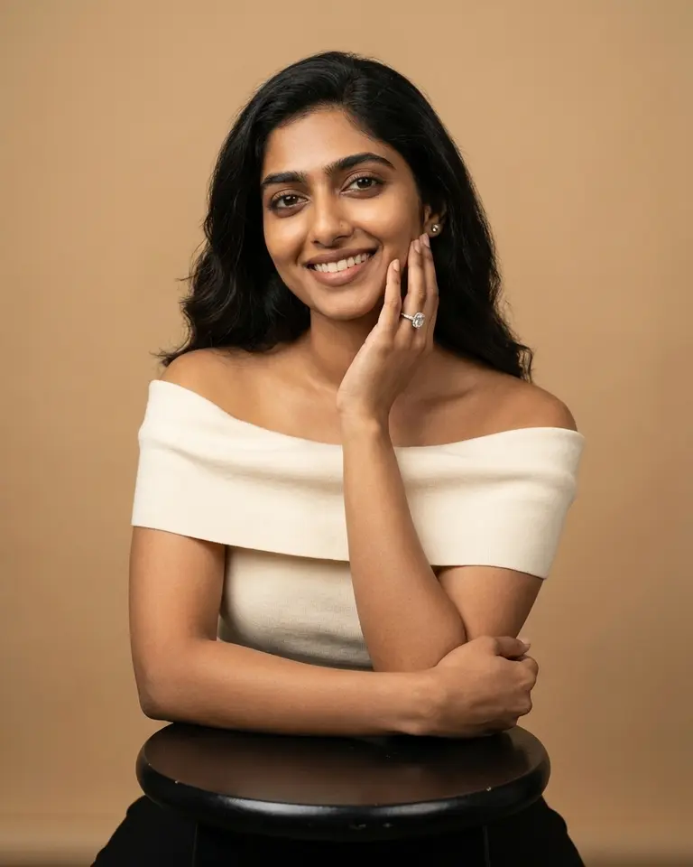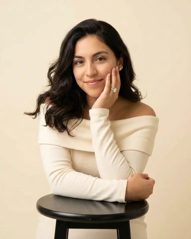 - Background: Solid seamless paper in warm cream/beige (matches skin and outfit tones).