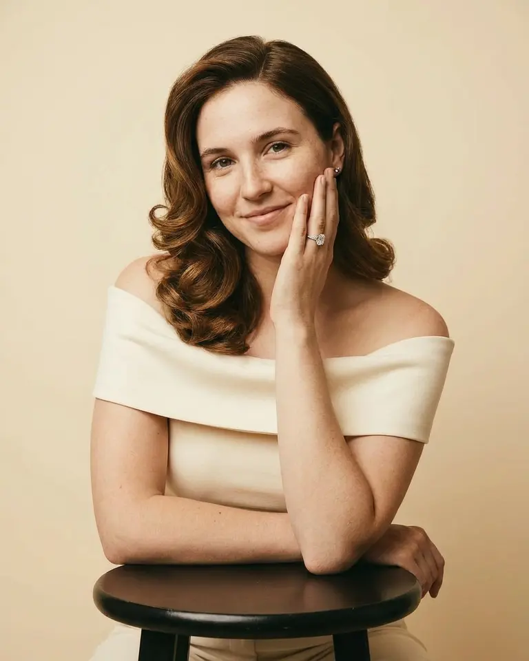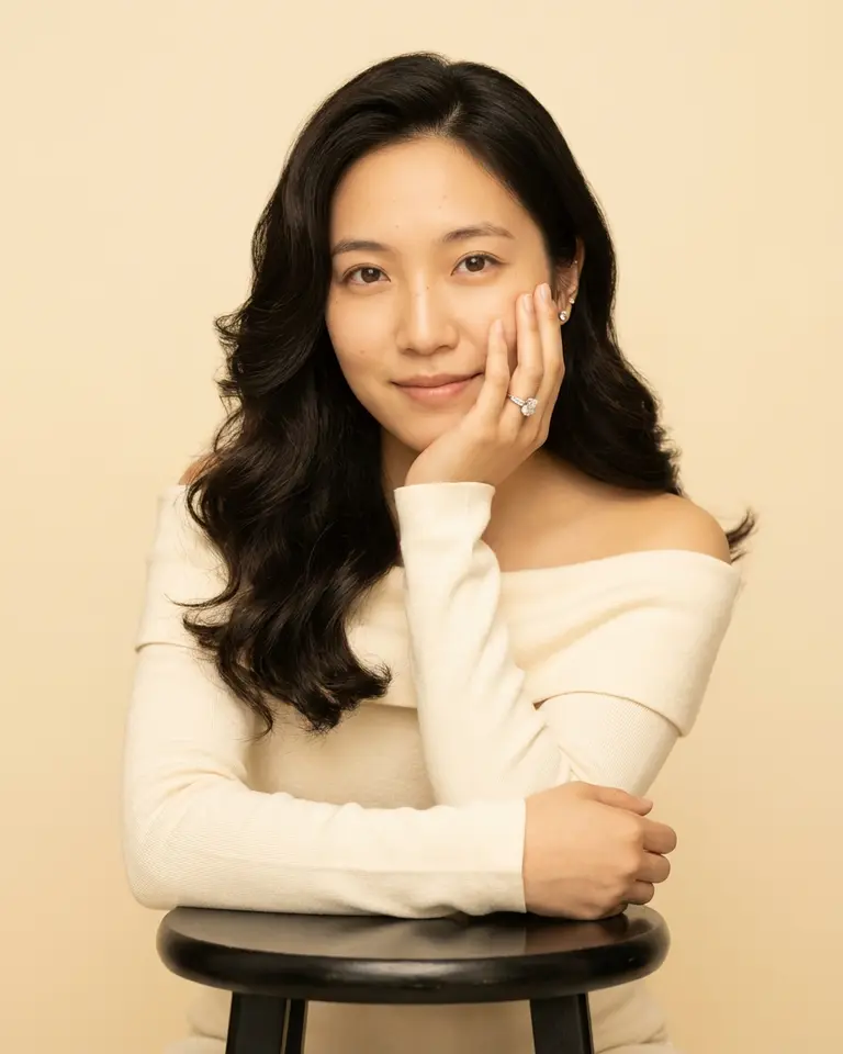 - Expression: Soft, genuine closed-mouth smile. Warm and engaging.
