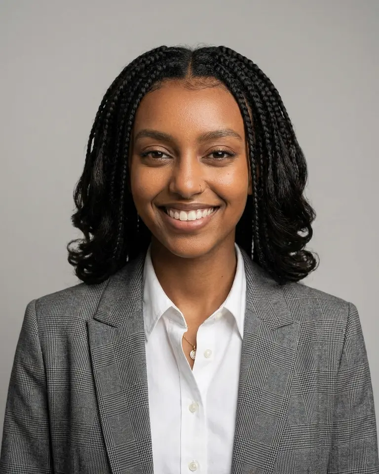 - Details: Grey structured blazer with subtle plaid/glen check pattern (critical), crisp white button-down collared shirt underneath (critical), open collar. delicate small pendant necklace. Hair styled with a polished, voluminous blowout look, smooth and neat, appropriate to person's natural hair.