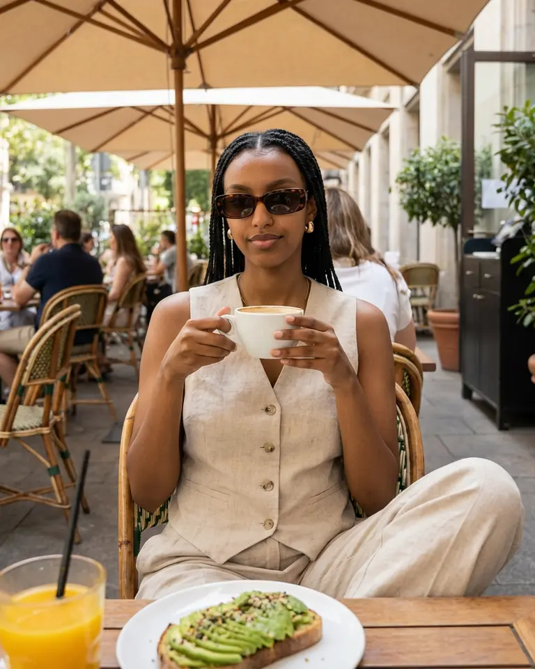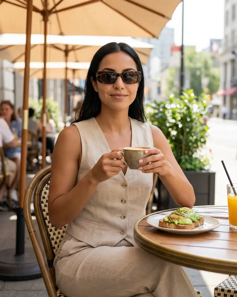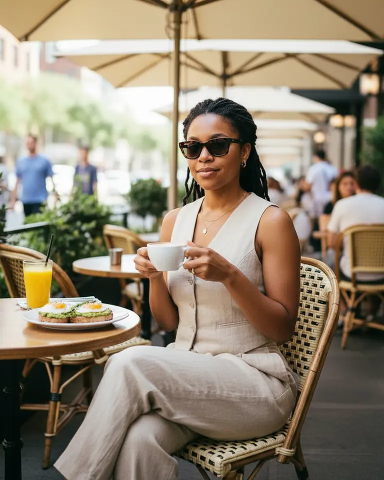 MOOD: Leisurely sophisticated brunch lifestyle. Relaxed, affluent, and enjoying a slow morning.