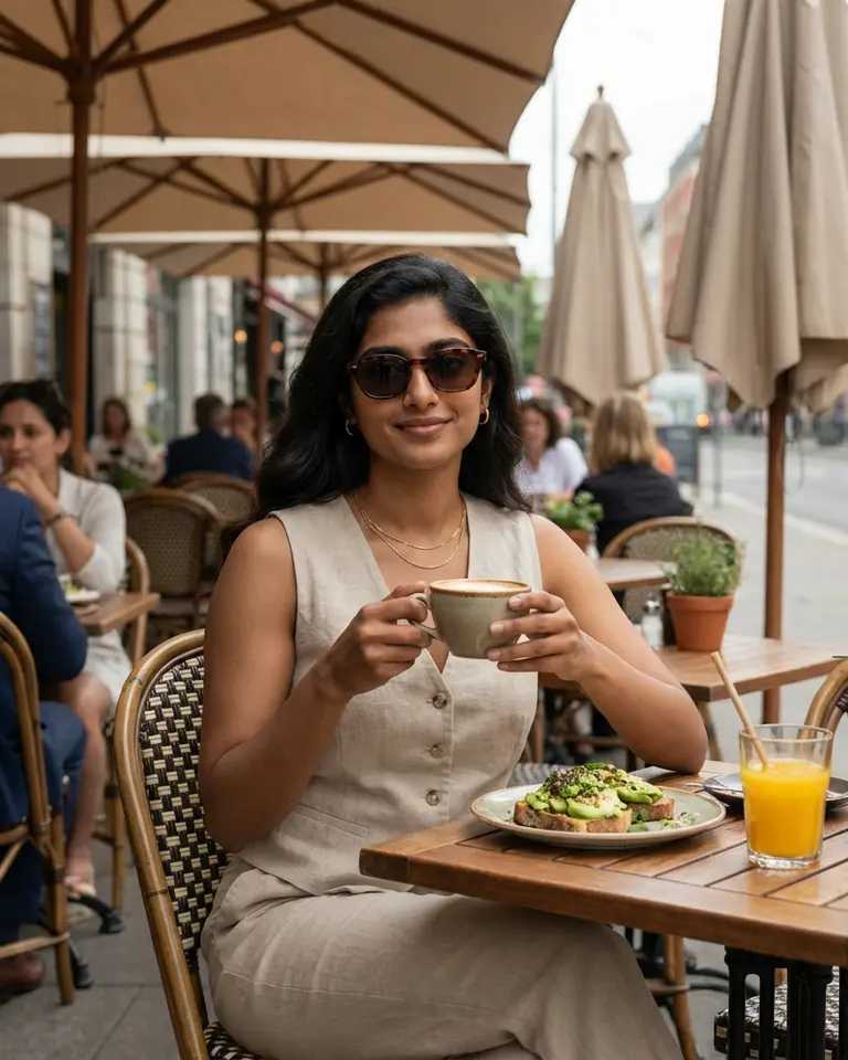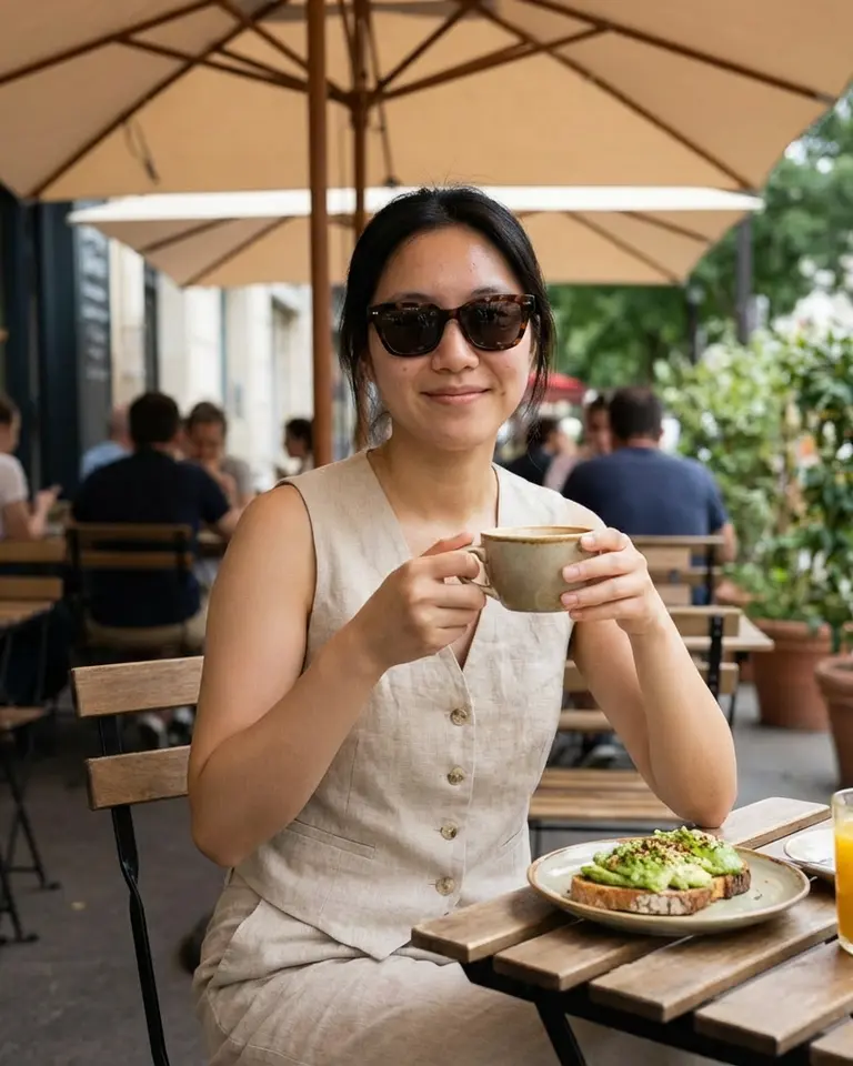 Transport yourself to a sophisticated al fresco brunch with this polished "old money" summer aesthetic. You appear in a crisp beige linen vest and dark sunglasses, relaxed at a sun-dappled bistro table. The soft lighting and upscale cafe setting give your image an air of leisurely affluence.