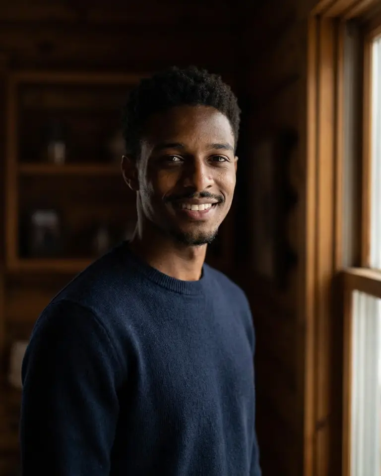 Step into the cozy atmosphere of a rustic cabin afternoon. Directional window light sculpts your features with rich contrast, blending warm skin tones with a moody, blurred wooden background. This style offers a relaxed, sophisticated look that feels like a quiet weekend getaway.
