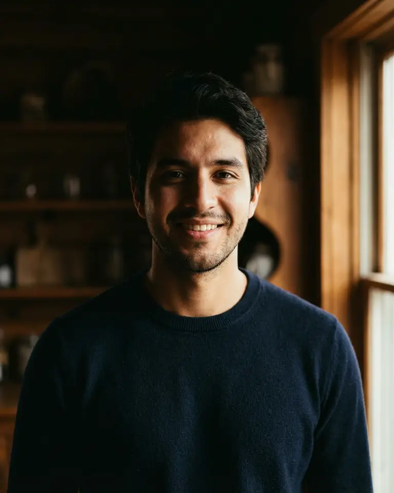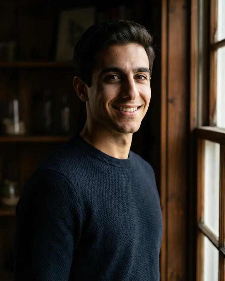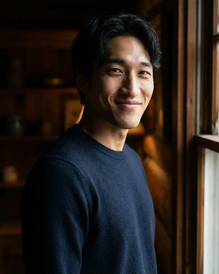 - Expression: Genuine, relaxed smile with natural crinkle in eyes. Authentic warmth, not stiff or posed.