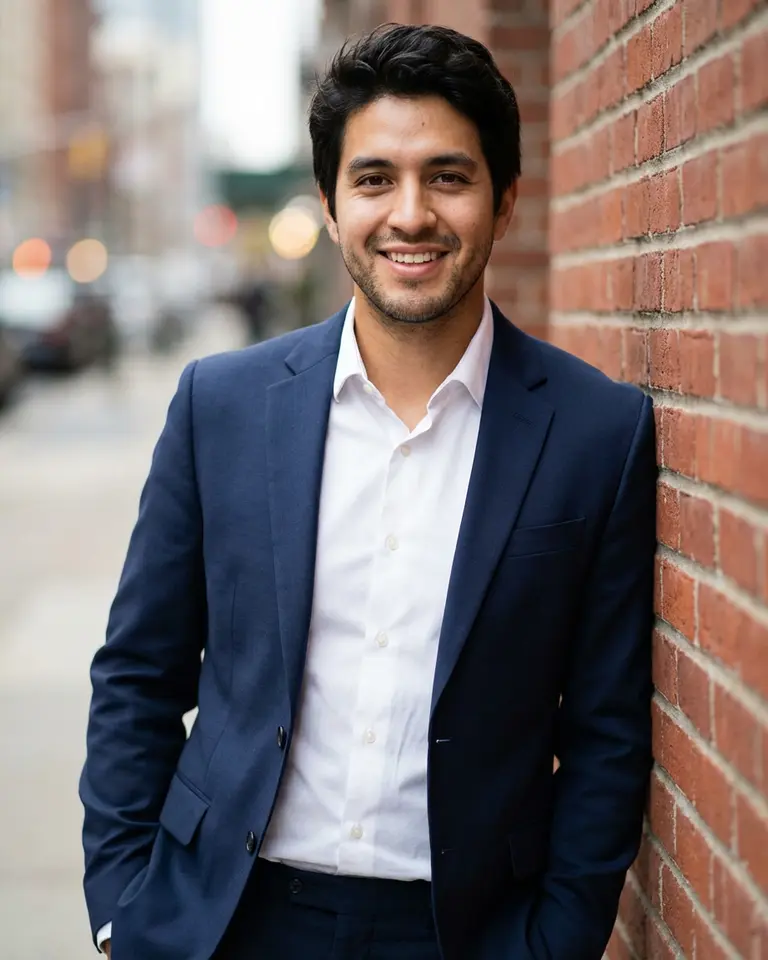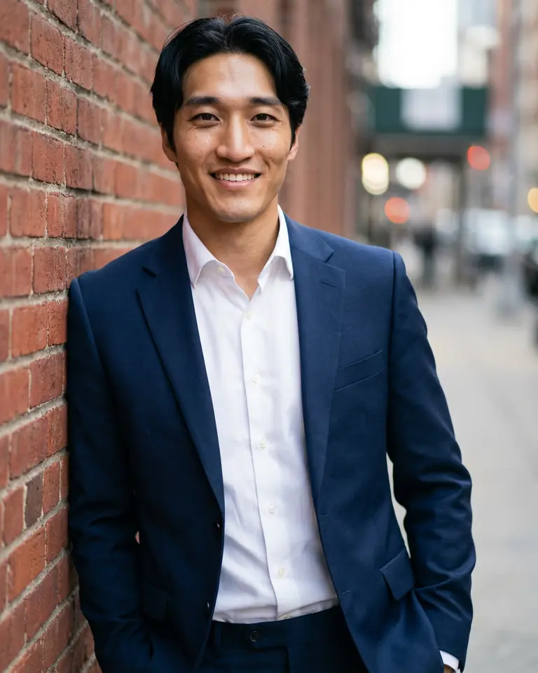 - Pose: Standing relaxed, leaning left shoulder and back comfortably against a wall, body angled 30° toward camera, hands tucked into trousers pockets or resting at sides in a casual professional stance.