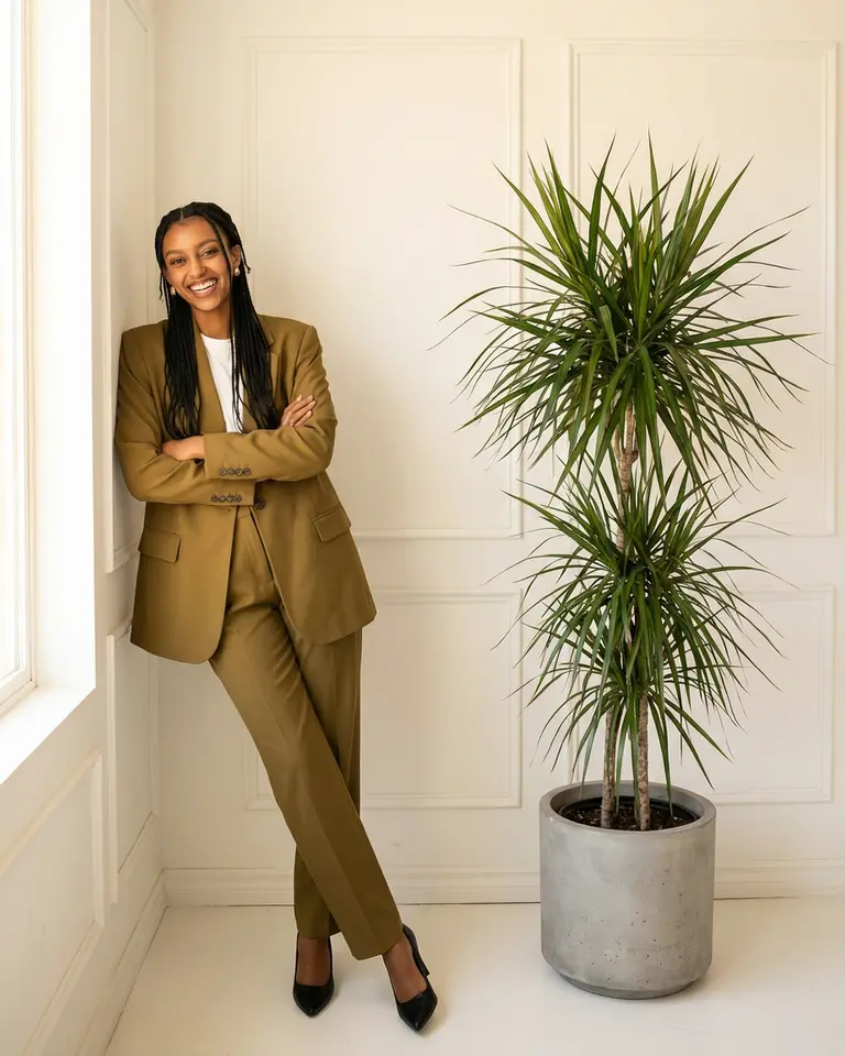 - Props: Large Dracaena Marginata plant in a GREY CONCRETE POT (round bulbous shape) placed on floor between subject and window.