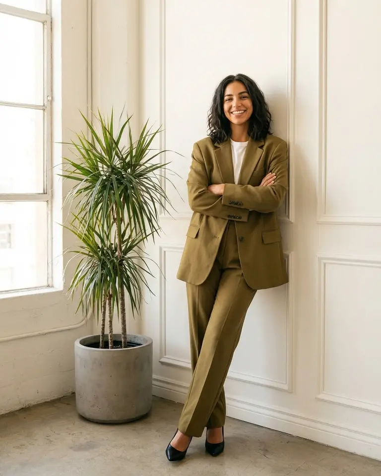 Step into a contemporary branding portrait that feels polished yet entirely unforced. This look styles you in a relaxed olive green blazer, leaning casually in a bright studio with classic white paneling. Soft, diffused window light and warm tones give your photo an approachable, modern finish.