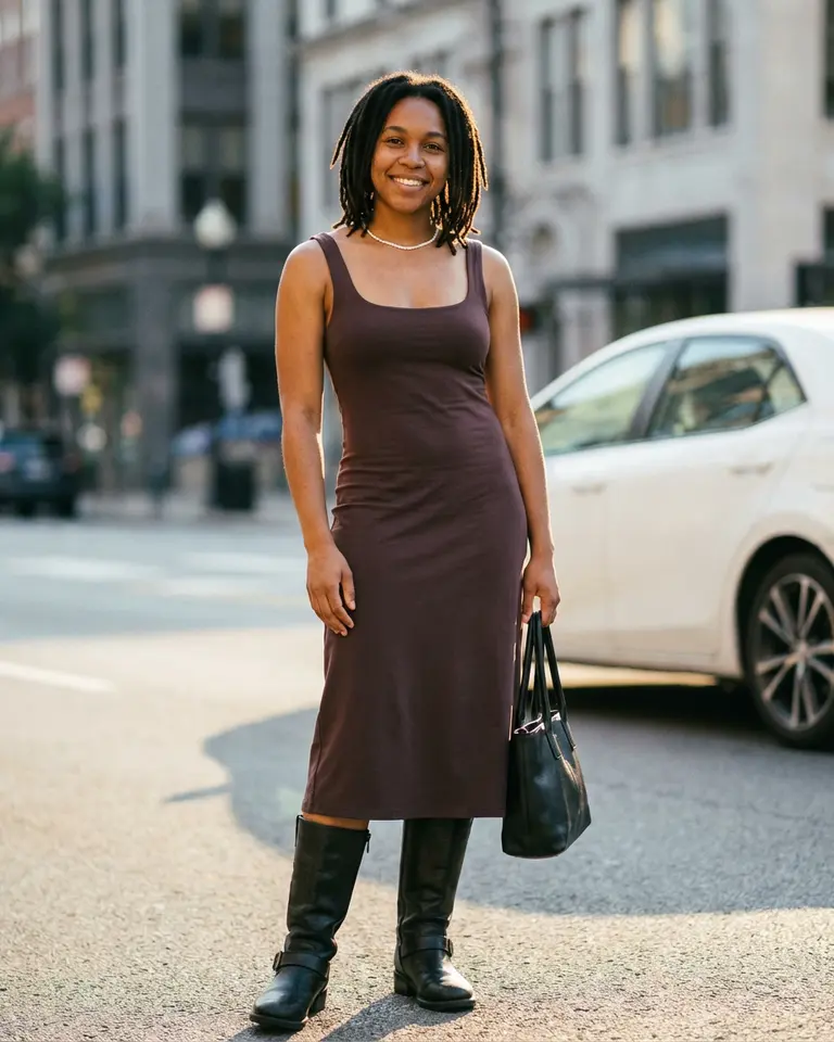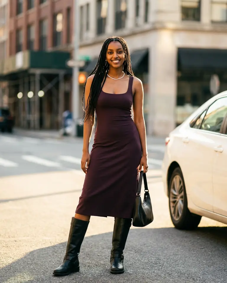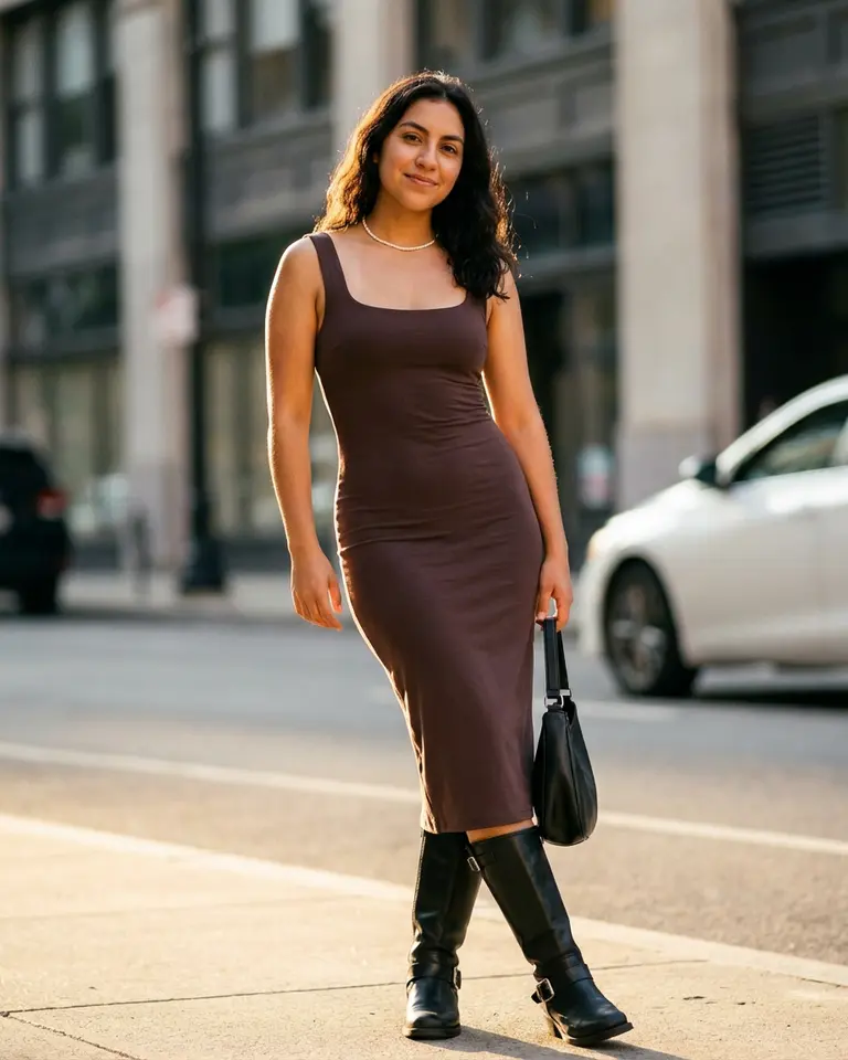 - Details: Dark brownish-plum midi dress with WIDE TANK-STYLE STRAPS (approx 1 inch wide) and SCOOP NECKLINE (critical). Fabric should be matte satin or jersey, fitting closely to torso. Black leather knee-high motorcycle boots with buckles. Small white beaded necklace.