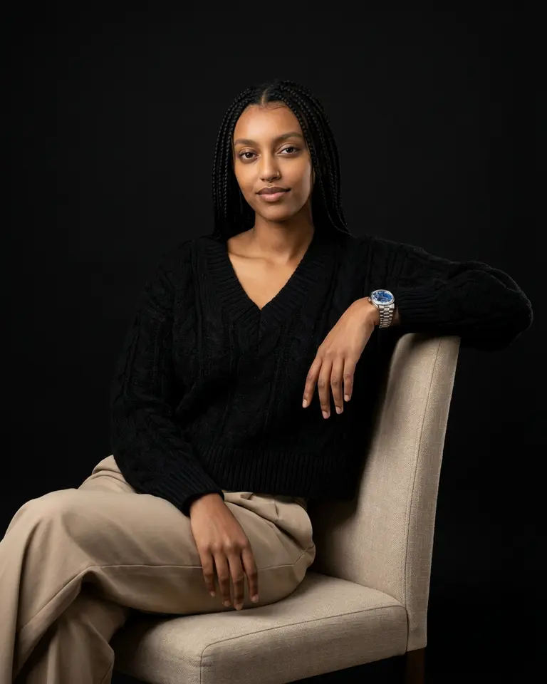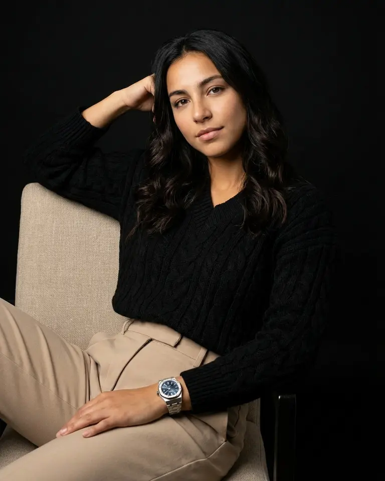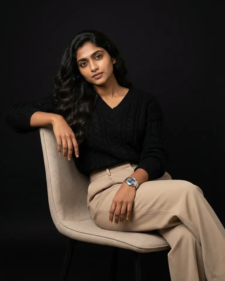 - Color & Grade: Neutral to slightly warm skin tones, rich blacks but detail visible in sweater, low to medium contrast ratio (NOT harsh). Soft luxurious finish.