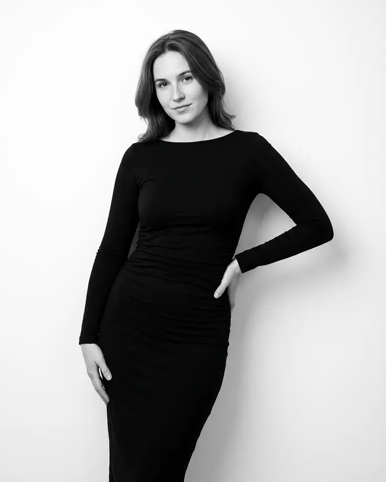 Channel the sophistication of timeless editorial photography with this minimalist black and white portrait. High-contrast lighting and a sleek, fitted dress define your silhouette against a clean studio backdrop. This aesthetic removes distractions to place the focus entirely on your poise.