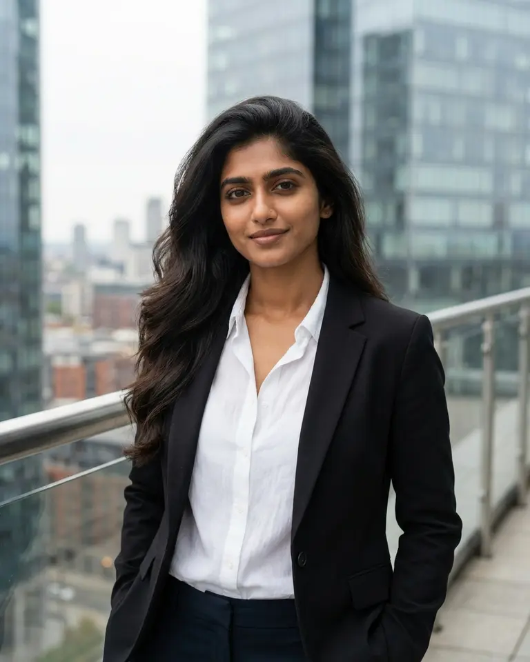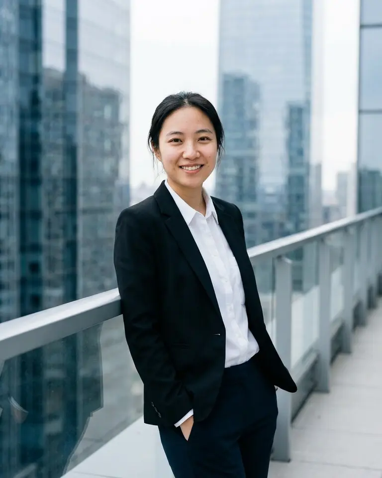 Refine your professional image with a modern executive look set against a high-rise city skyline. This style features a sharp tailored blazer and soft, diffuse daylight for a clean corporate aesthetic. It creates a confident business presence defined by cool urban tones.
