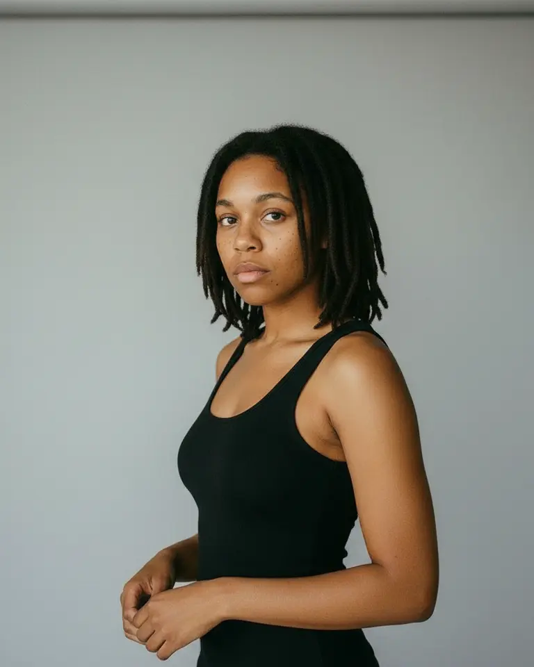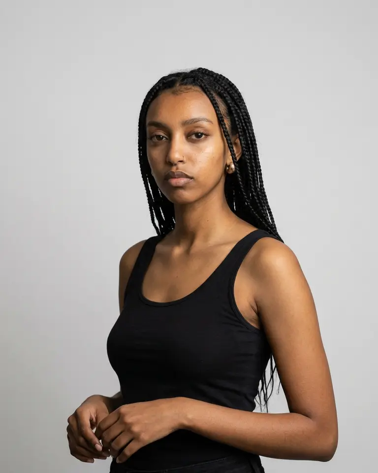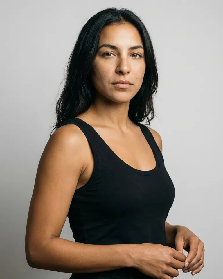 - Details: Basic black cotton tank top with scoop neckline and medium-width straps (critical), tight fitted silhouette. No jewelry, no accessories. Hair styled naturally with minimal product, falling loosely around shoulders.