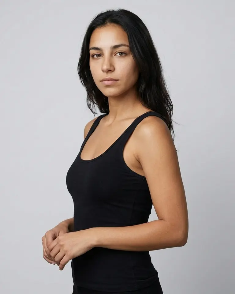 See yourself through the lens of a professional modeling agency casting session. This contemporary "digitals" aesthetic uses a seamless grey backdrop and soft studio lighting to create a clean, high-end portfolio look. The minimalist styling places you in a fitted black tank top to ensure the focus remains entirely on your features.
