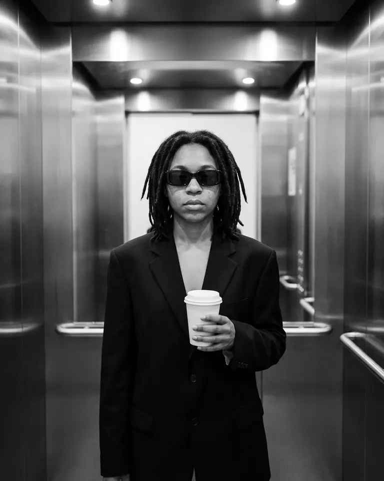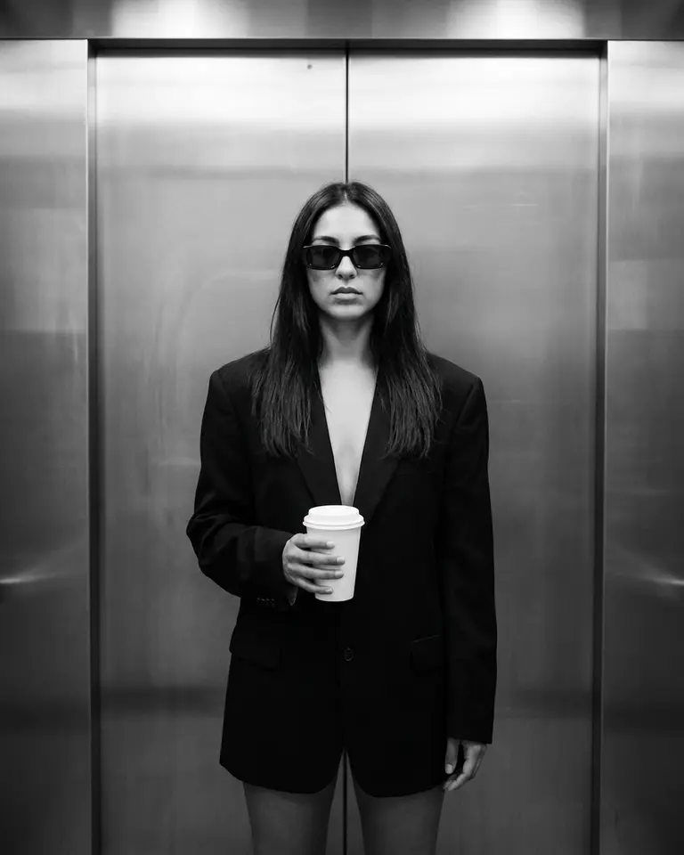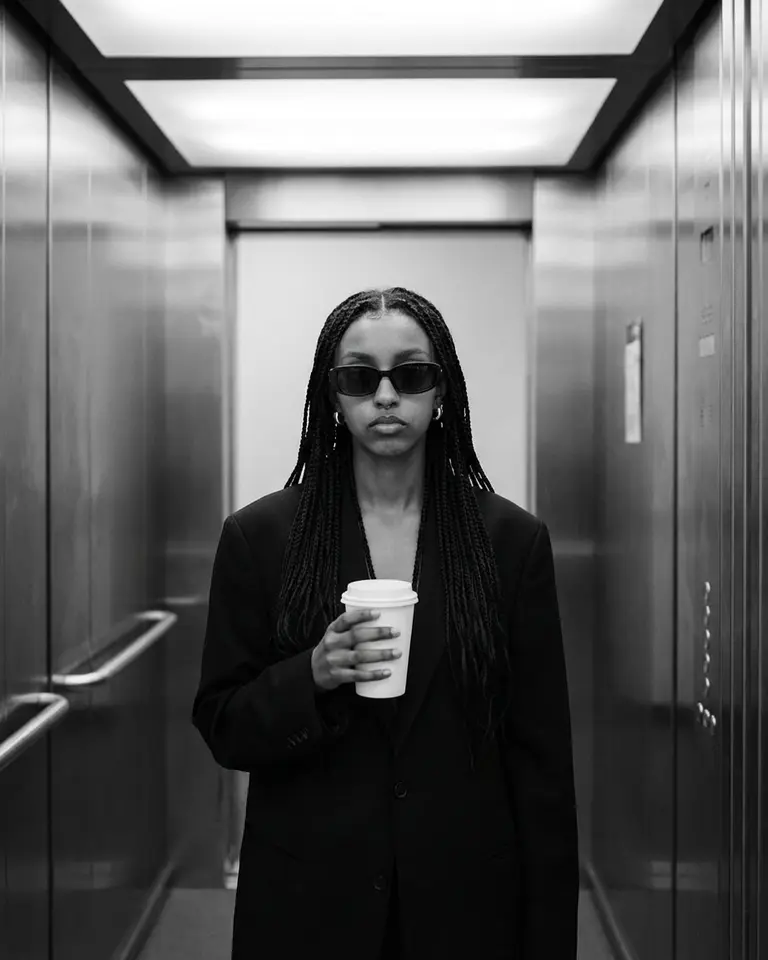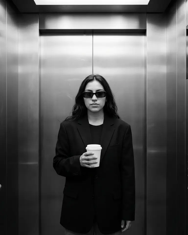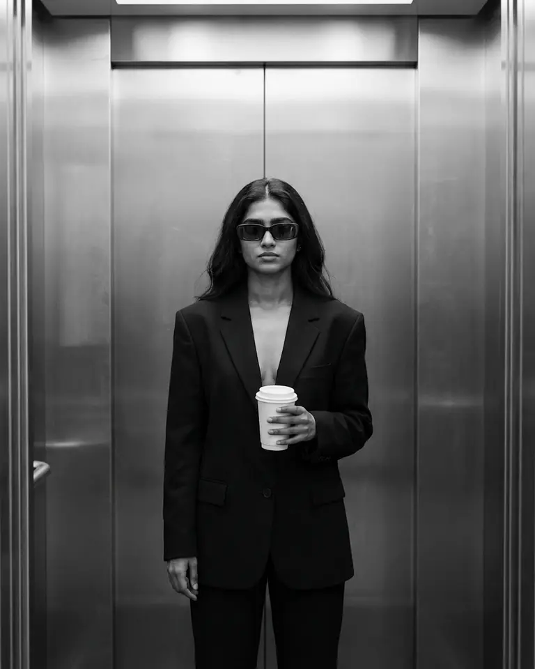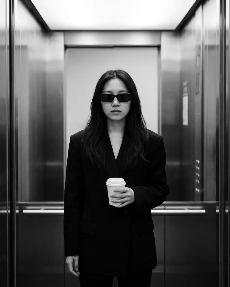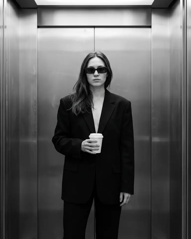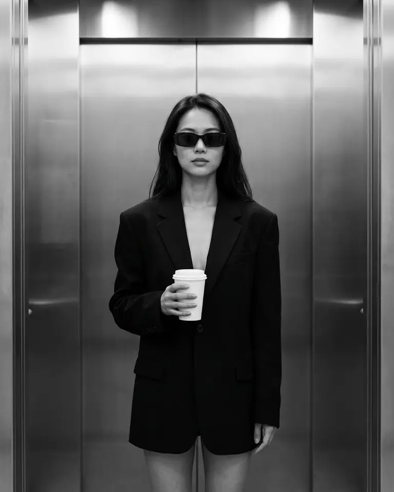 - Environment: Modern elevator interior. Brushed metal walls with vertical panel seams behind subject. Closed elevator doors.