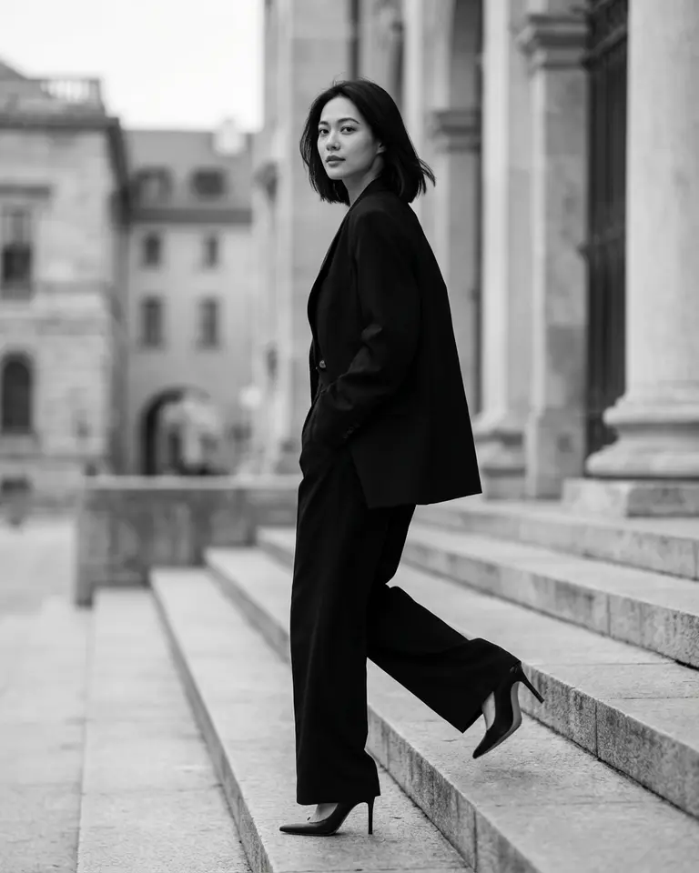 - Aesthetic: Oversized urban tailoring, chic street style, masculine-feminine mix.