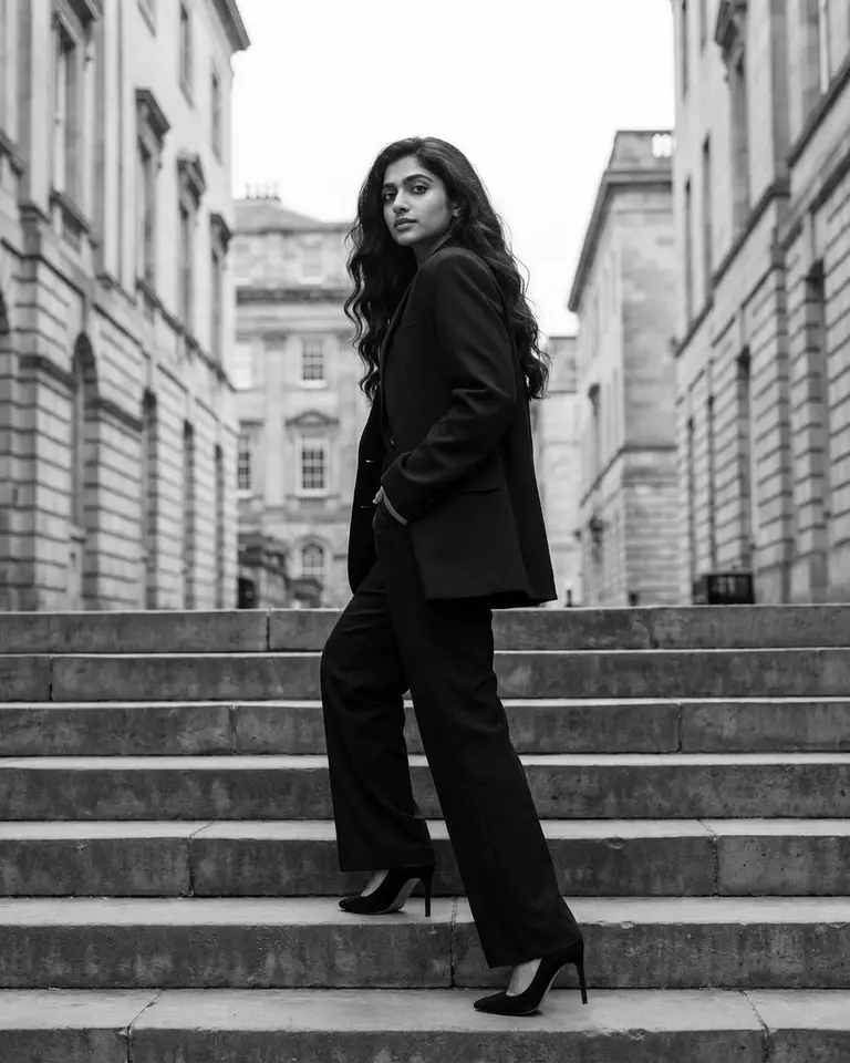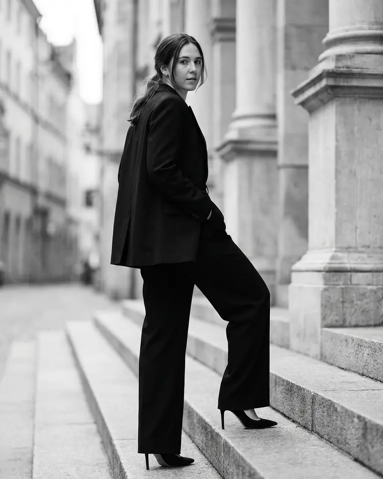 - Expression: Neutral, confident, sophisticated, slightly pensive.
