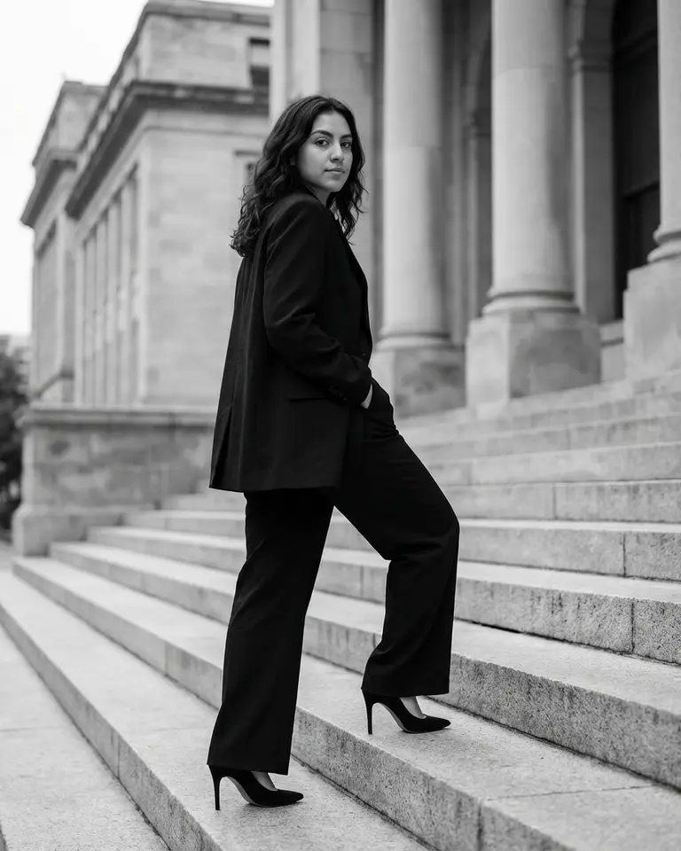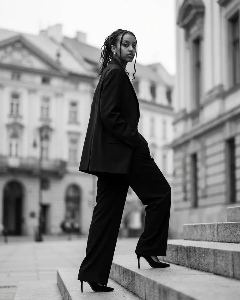 MOOD: Candid fashion editorial energy. Sophisticated urban walk. Confident and unbothered "girl boss" vibe.
